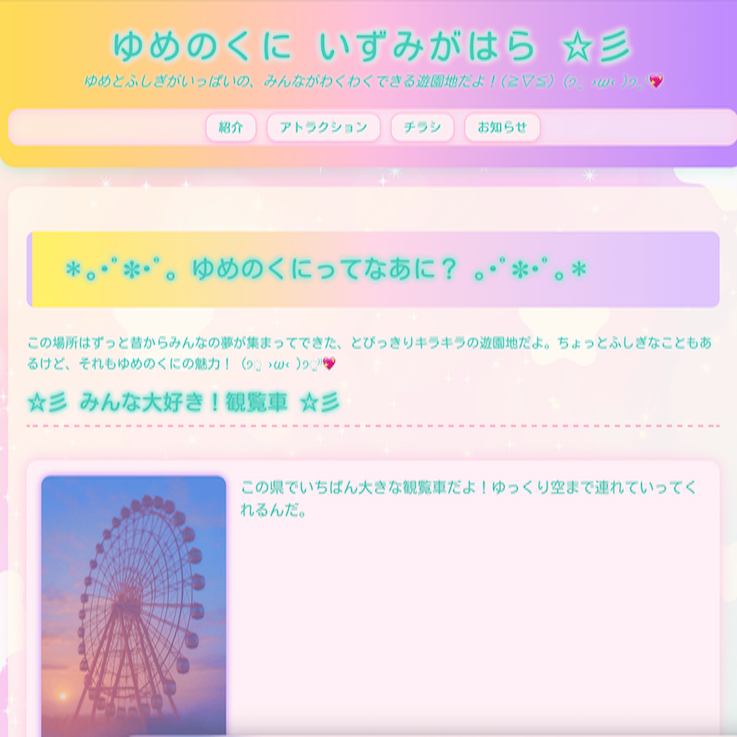 前回陰謀論についてまとめたので似たジャンルのものを違う系統の電波系サイトとしてまとめてみる試みです。今回は楽しげな電波系を目指すので架空の遊園地の公式HPを模しています。