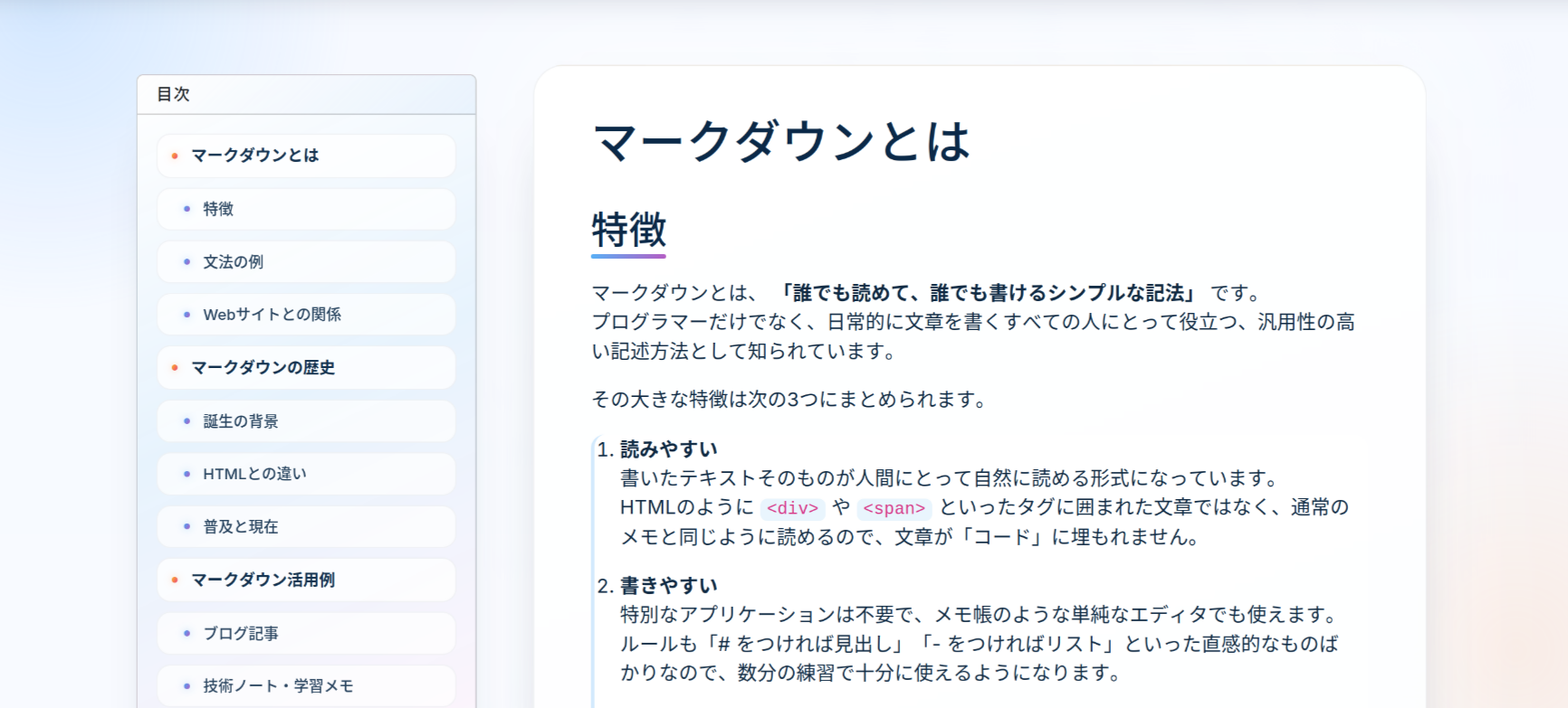 Markdown(マークダウン)は、見出しや箇条書きといった文書構造をシンプルな記号で表現できる記法であり、HTML のような複雑なタグを使わずに、読みやすく整理された文章を記述できる。この利便性から、GitHub、Qiita、Zenn、はてなブログなど、さまざまなプラットフォームで採用されている。