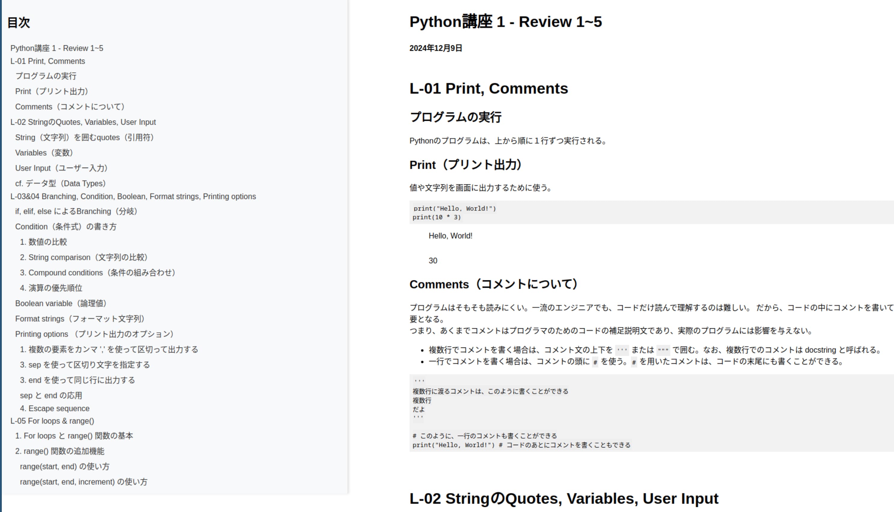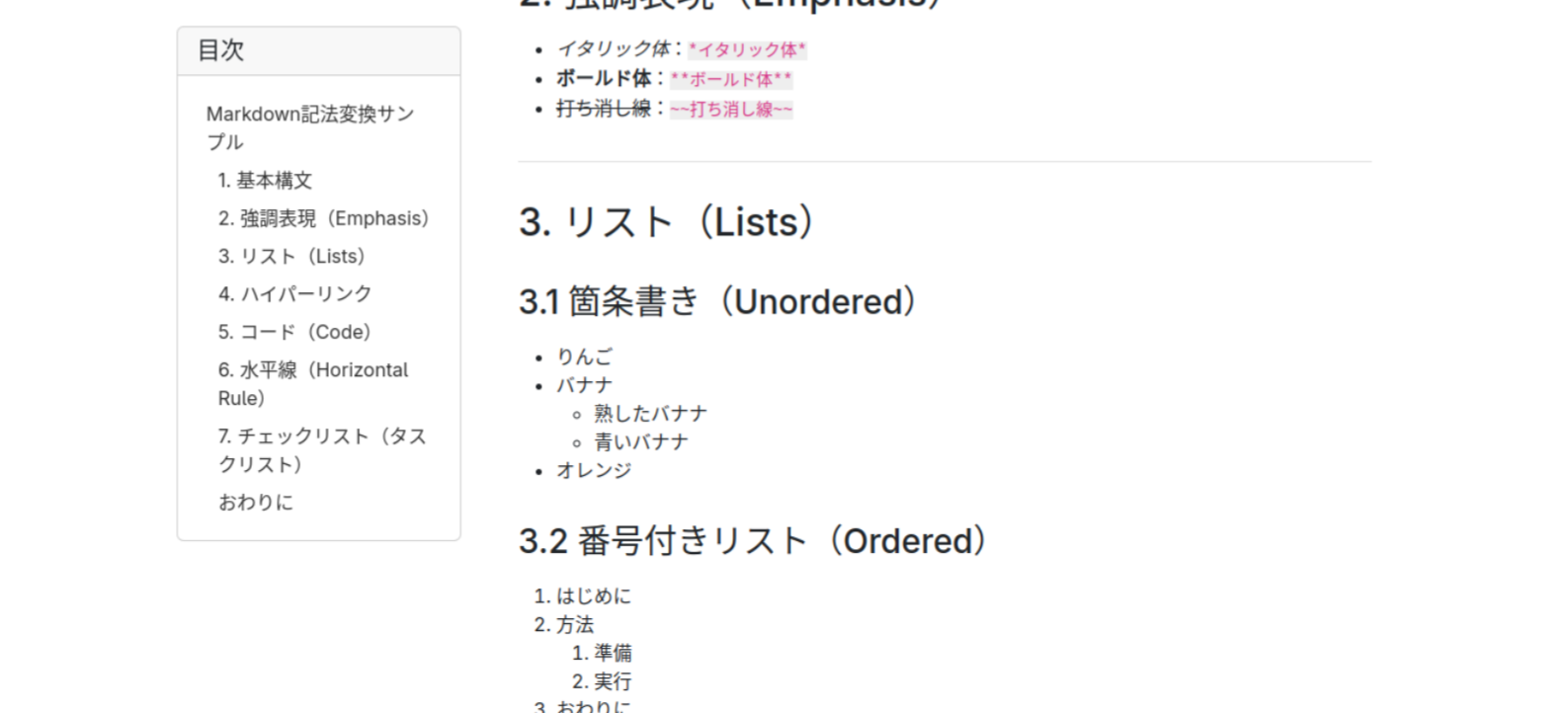 MarkDownファイルの「見出し1(#)」と「見出し2(##)」を自動で読み取って、目次が自動生成されるようにした。(画像左部)
