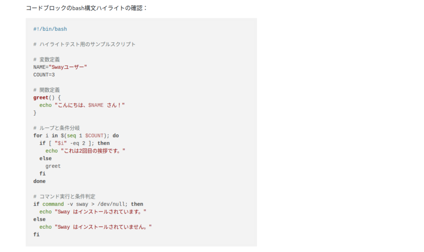 - ✅ コードブロックの構文ハイライト機能(画像はbash文)
