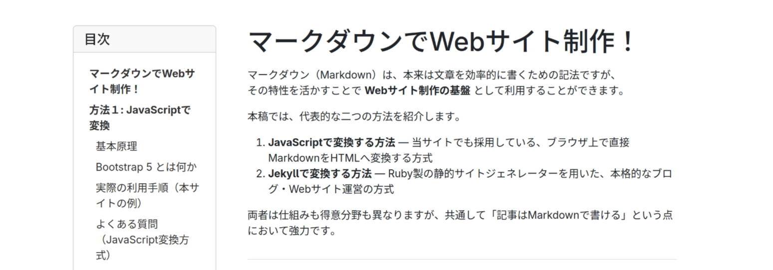 本サイトは、Markdown 形式で記事を管理し、それを JavaScript によって HTML に変換し、GitHub Pages を利用して公開するという、ビルド作業のいらない Web サイト制作手法を解説するドキュメントサイトである。