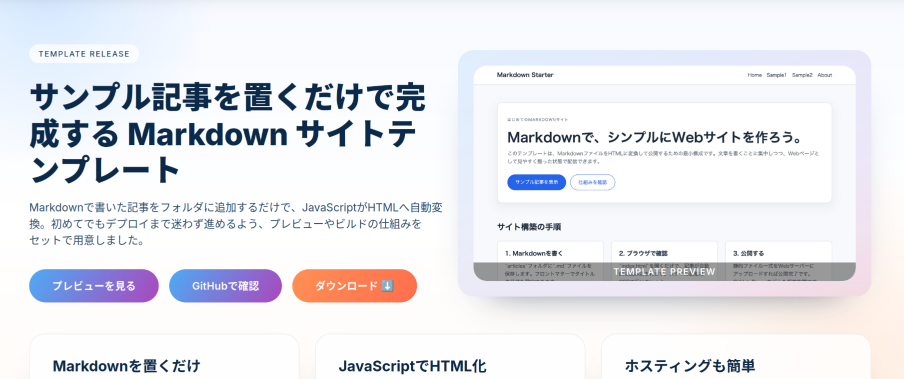 - 「テンプレートサイトのプレビューリンク」「Githubリポジトリへのリンク」「ダウンロードリンク」の3つのボタンを配置した。