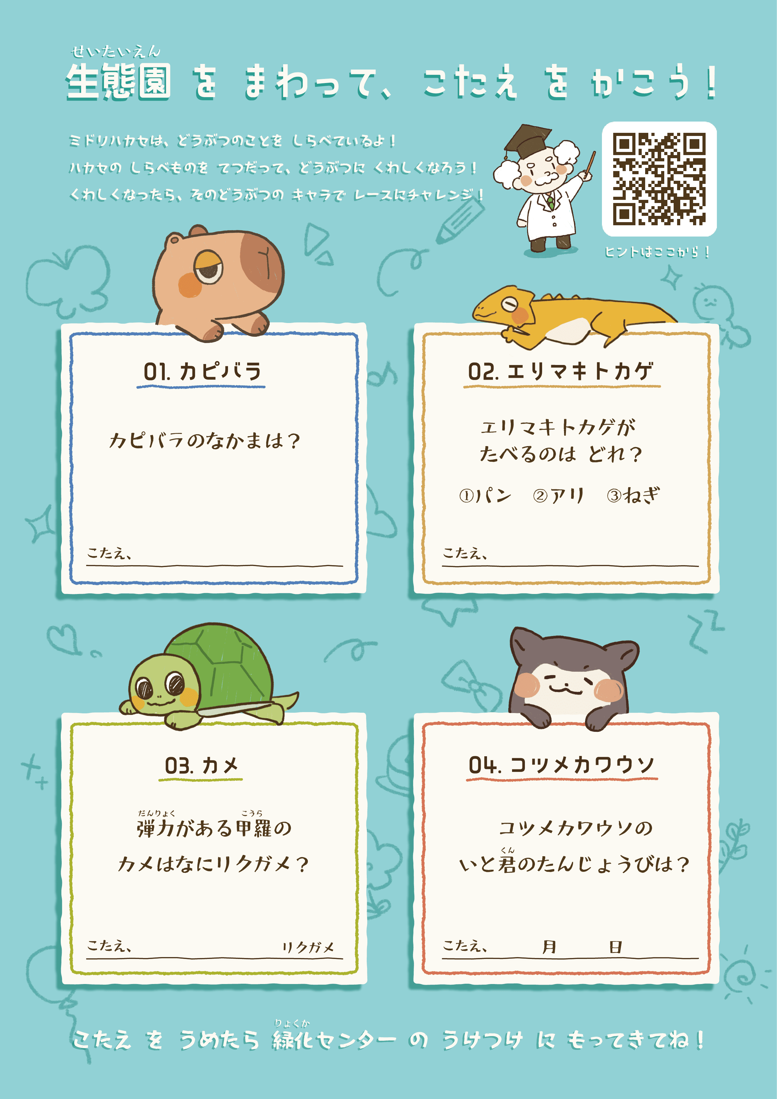 響灘緑地GREEN PARK内にある熱帯生態園を会場にした、小学校低学年向けの体験型イベント。園内を巡って動物クイズに挑戦し、獲得したキャラクターで最後にレースゲームを楽しめる構成となっている。