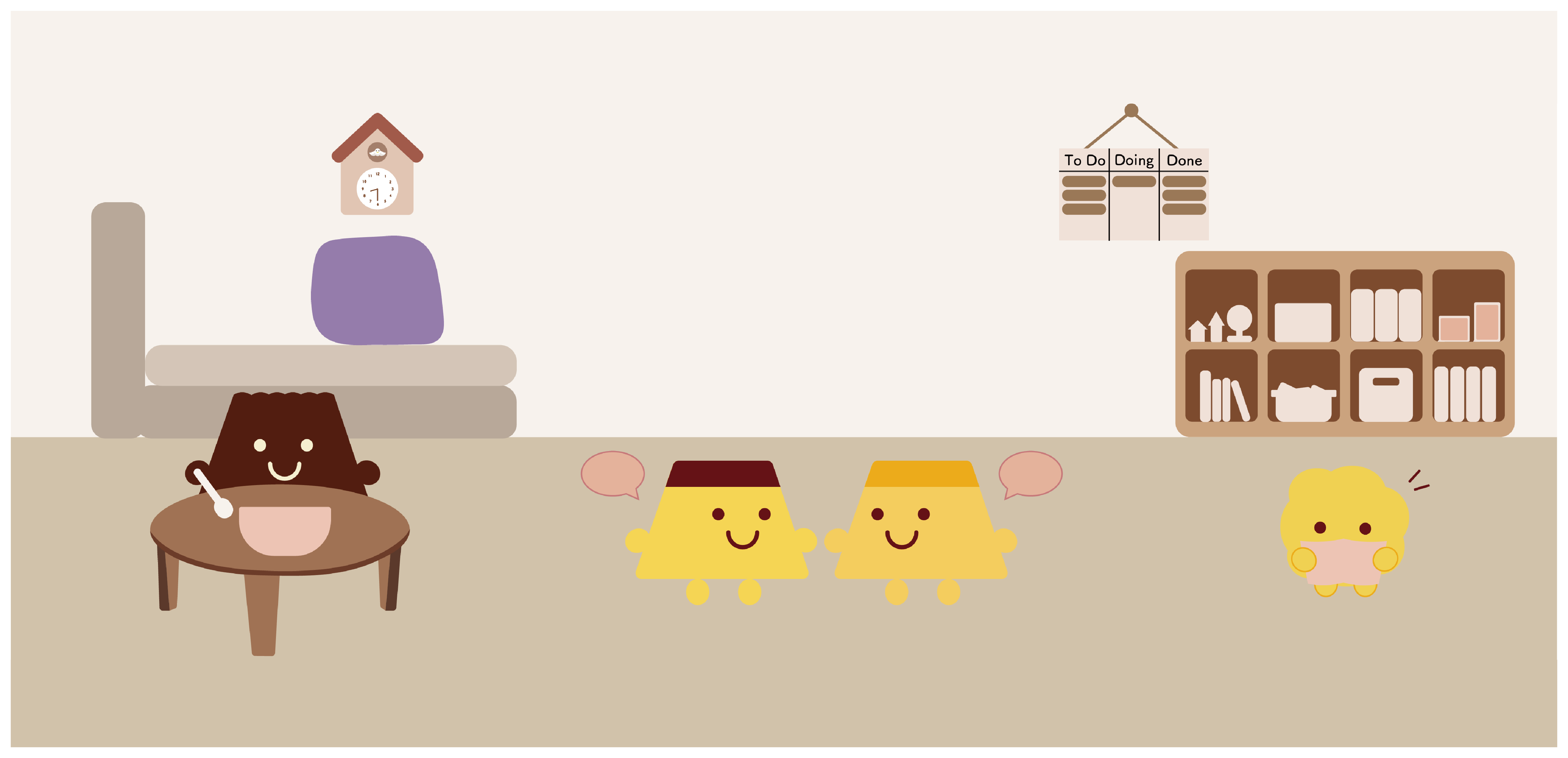- 部屋の雰囲気が伝わりキャラクターが集合しているものをメインビジュアルにした。