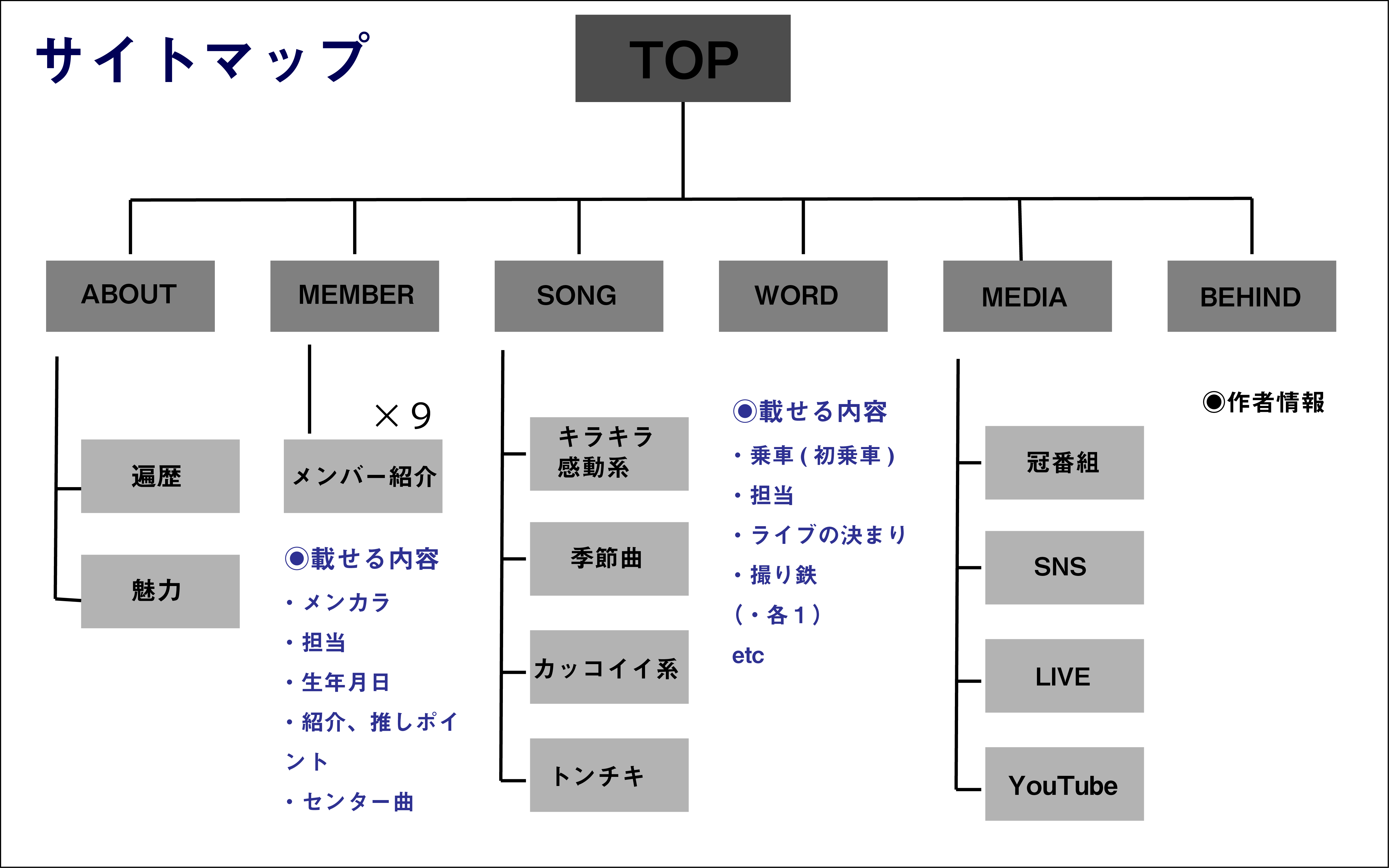 - HOME、ABOUT、MEMBER(個人ページは💙💜のみ)がクリック可能です!