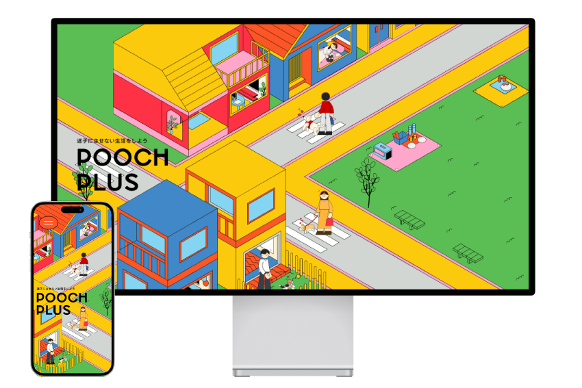 迷子対策をネガティブなイメージで捉えるのではなく、愛犬との生活をより良くするためのポジティブなイメージとして捉えてもらいたいため、ポップな印象のデザインにする。また、犬を飼い始めた人や飼おうと思っている人にもわかりやすいよう、用途に分けてイラストを使用する。