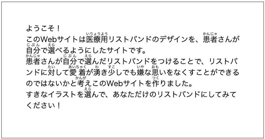 本研究は私が小学生の時に長期入院をした経験から、患者さん自身でカスタマイズしたリストバンドならつけるのが嫌で取りたくなる存在から、つけてもいい許容出来る存在になるのではないかと考え研究に至った。前期では、リストバンドの試作や、Webサイトのプロトタイプを制作することができた。後期では前期で考えたリストバンドのカスタマイズが現実的ではなく変更することになったが、イラストの色を増やしイラスト自体もフリー素材ではなく自分で制作することができた。また、Webサイトの制作は初めてだったので非常に難しかったがこどもが操作することを考え、ふりがなを使用したり操作方法が簡単なラジオボタンにしたりするなどターゲットを中心に制作することが出来たと考える。