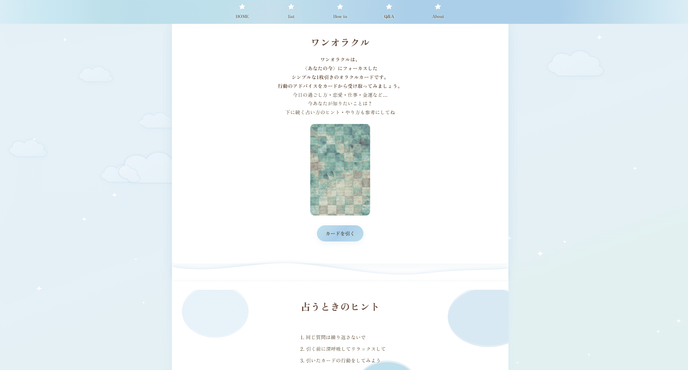 本作品「私をいたわる やさしい占い」は、「わかりやすく、怖くない」をコンセプトに、優しく自分を労りながら前向きな一歩を踏み出せるようにデザインしたオリジナルの占い(オラクル)カードと、そのデジタル版を展開するウェブサイト。