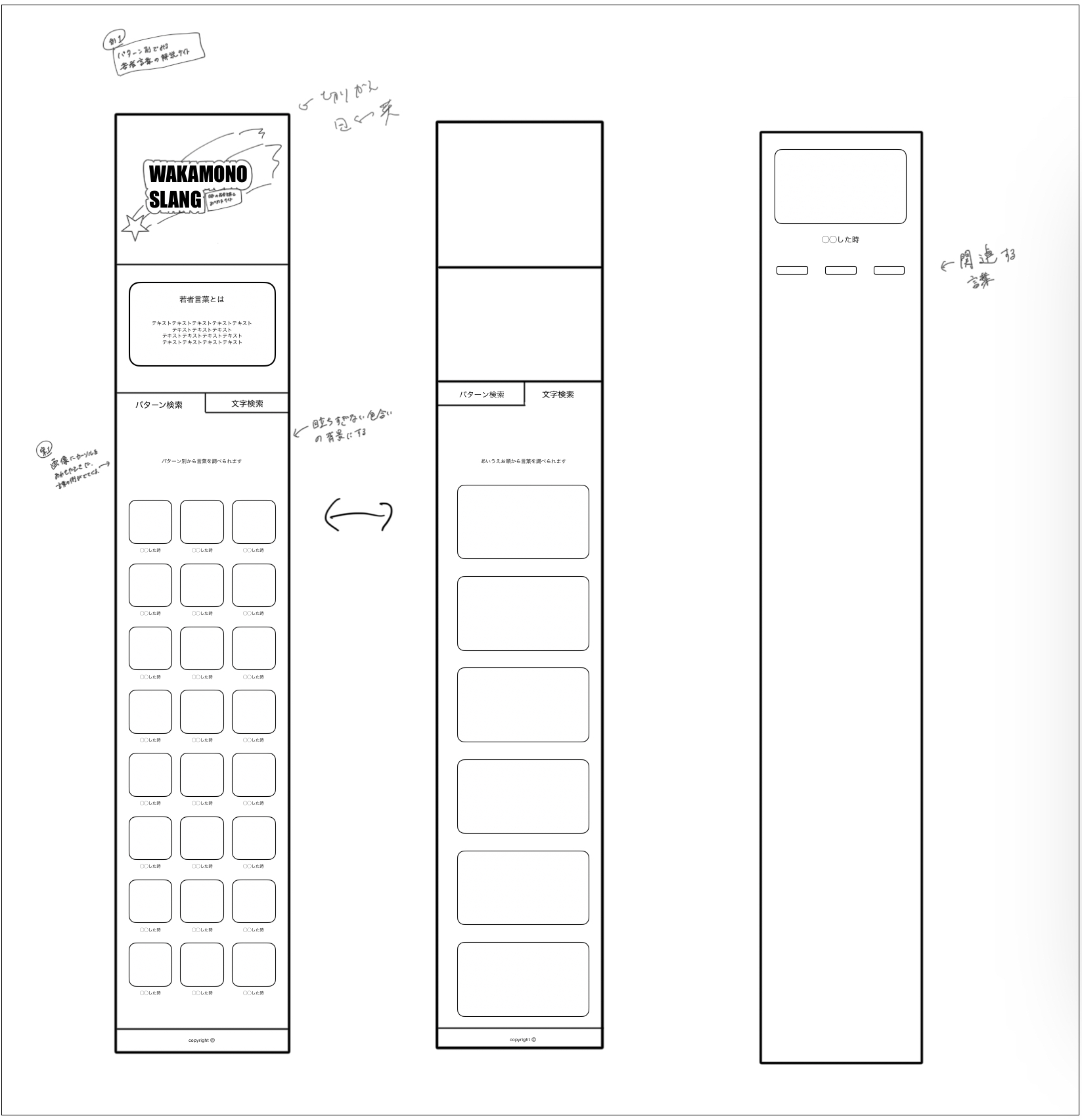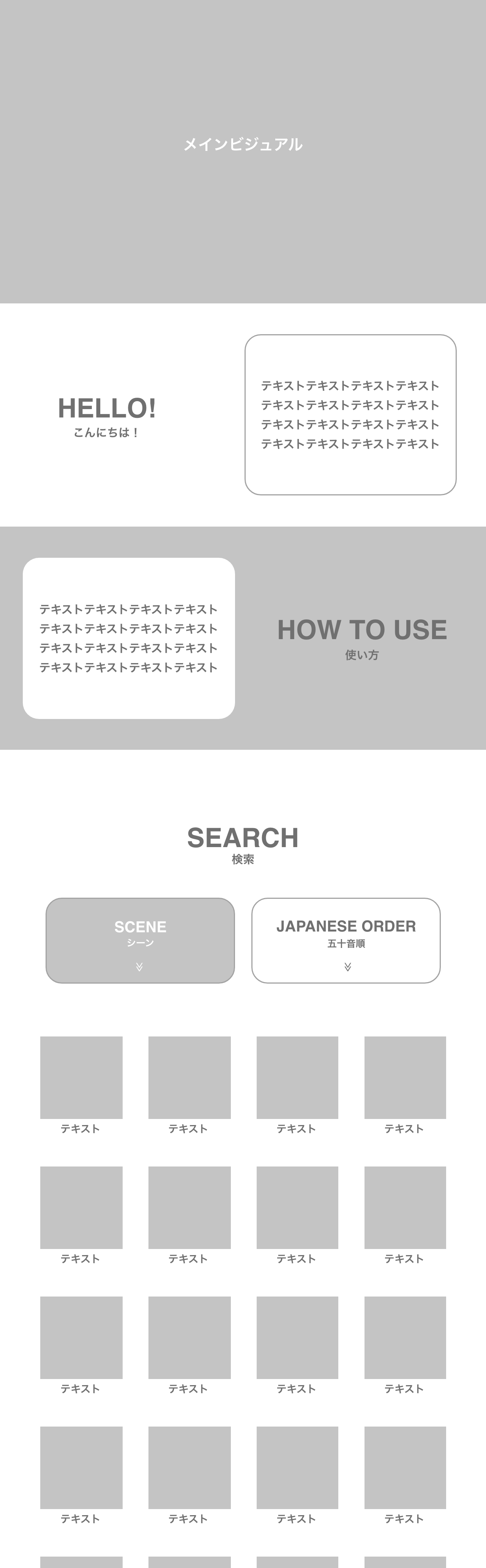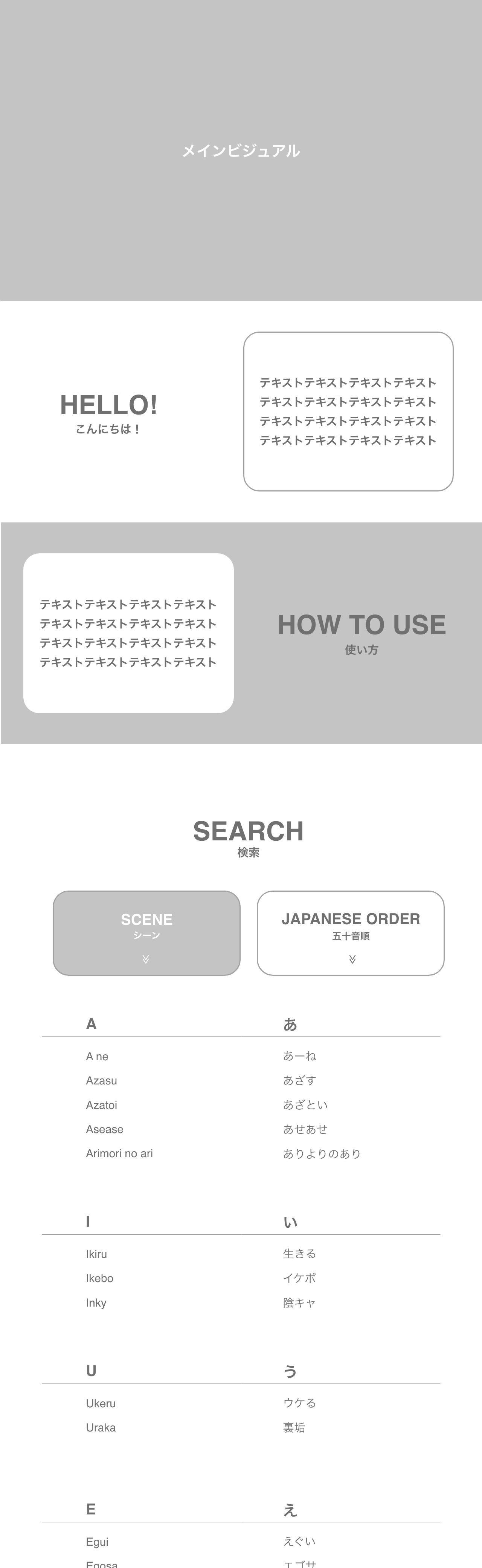 - 文字順だけでなく、場面別で調べられるように設計(タブで切り替え)