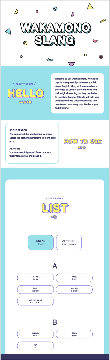このような現状から、若者の間で流行している言葉の意味を英語で表現し、それらをまとめたWEBサイトを制作することを決めた。本研究では、さまざまな形で生み出されていく若者言葉の意味について、このサイトを通して外国人に理解してもらうことを目指す。