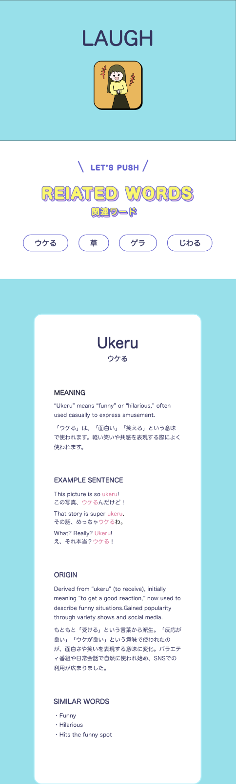 英語には言葉の表面的な意味が同じでもニュアンスが異なる単語が多く存在する。そのため、現在使われている若者言葉の意味と若者言葉を翻訳した英語の意味が大きく異ならないように意識しながら制作を進めた。実際にサイトを外国人に見てもらったところ「今までわからなかった言葉の意味が理解できた」「イラストがあってとてもわかりやすかった」といった感想を得ることができた。このことから、WEBサイトを通して若者言葉の意味を外国人に伝えることができたと考える。