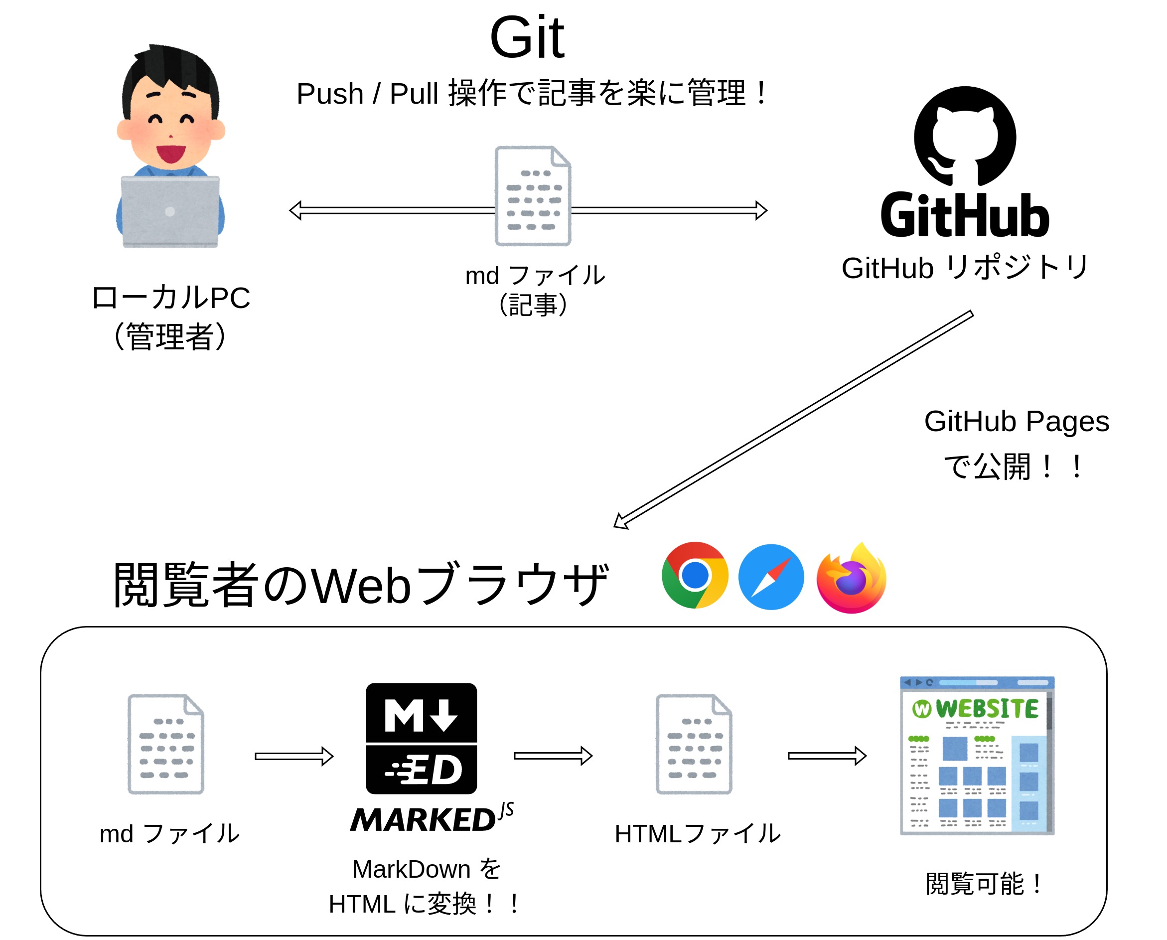 - Github Pagesを使い、ローカルのGit RepositoryでMarkDownファイルに変更を加えた際、GithubにPushするだけで記事を更新できるようにする。
