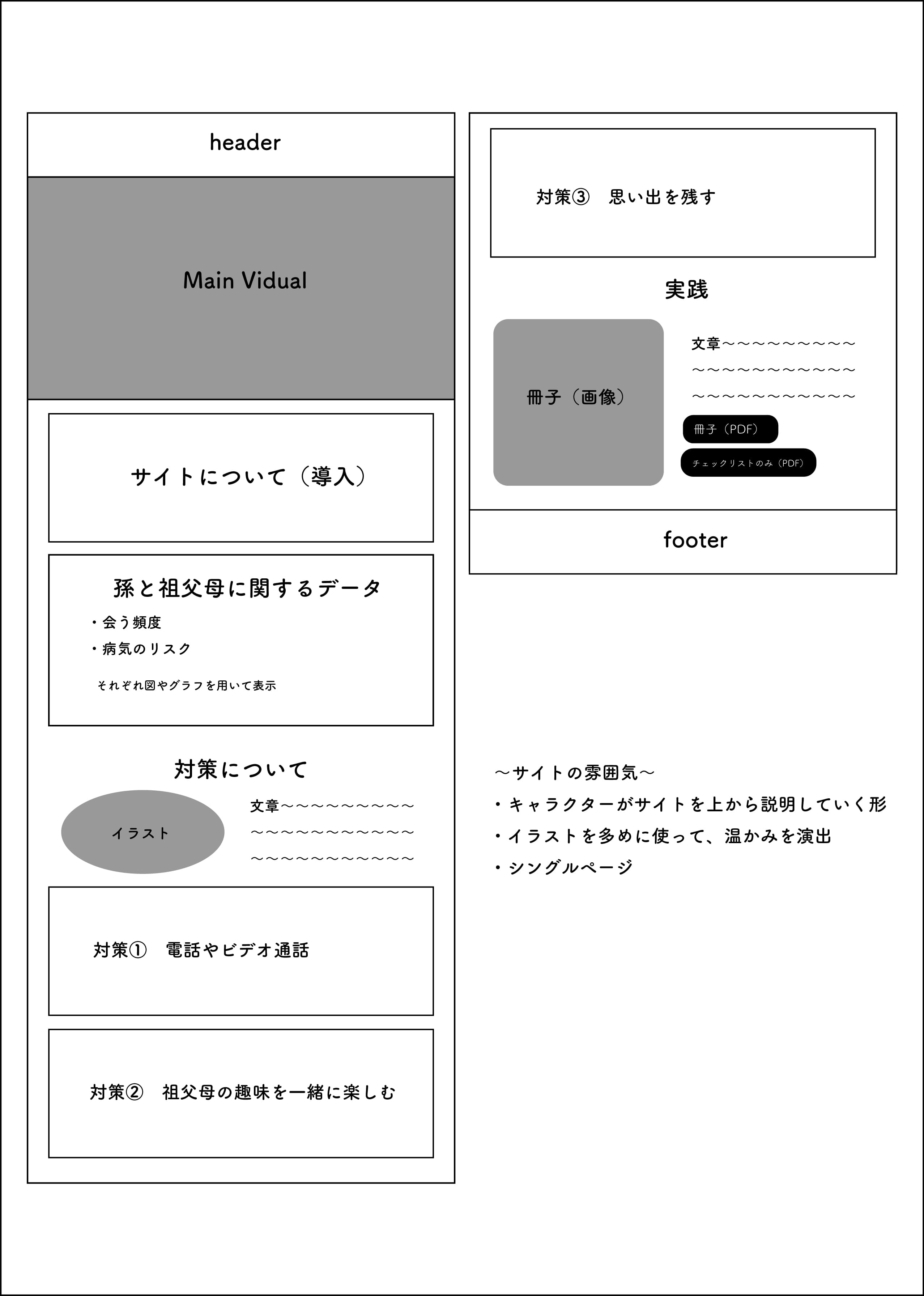 「今だからできる関わり」を見つけ、実行し、それを記録として残すことで、祖父母との思い出を可視化し、家族間の話題や絆のきっかけを生み出すことを目的とする。