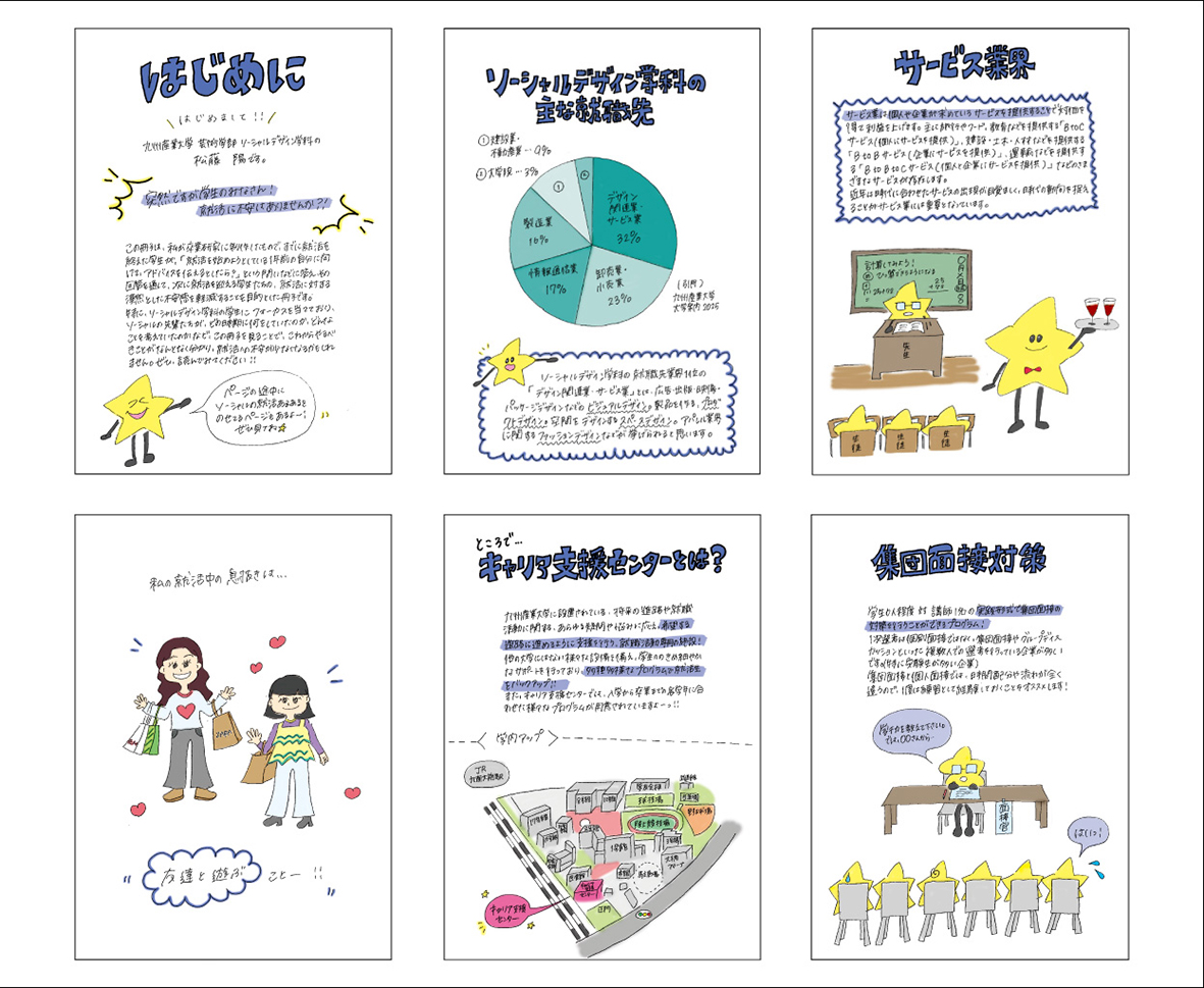 すでに就職活動を終えたソーシャルデザイン学科の学生が「就活を始めようとしている一年前の自分に向けてアドバイスを伝えるとしたら?」という問いに答え、その回答を通して次に就活を迎える学生たちの、就活に対する漠然とした不安感を軽減することを目的とした冊子の制作
