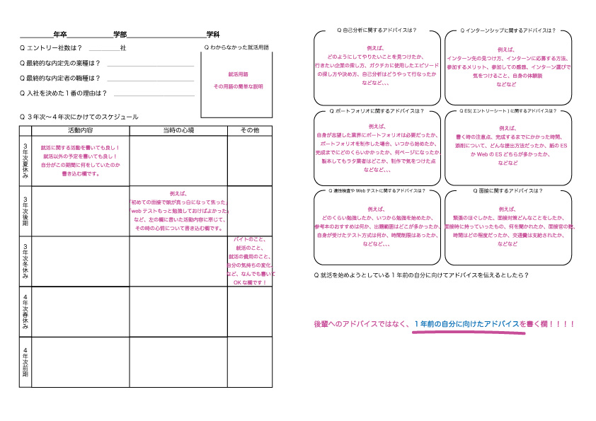 そのような時期に、大まかにでも就活に対する問題や、経験された先輩方が大事だと思っている事柄、いつの時期に何をしてきたのか、、、などがまとめられているものがあると、言葉に表せない不安感に対する質問を言語化する必要もなく、ある程度の就活の流れを理解することができ、少しでも不安が解消されると考える。