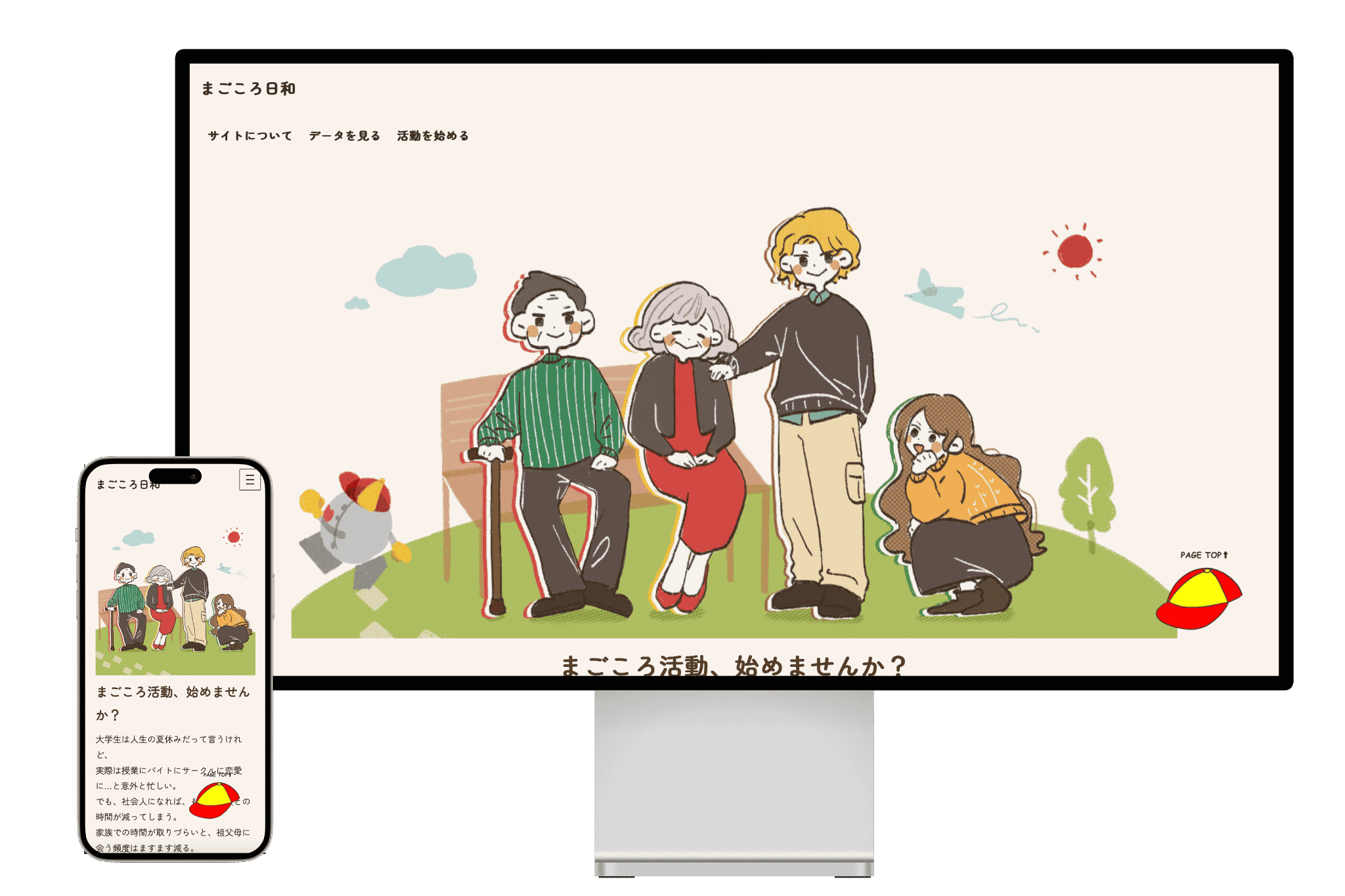 アンケート調査のデータから大学生と祖父母の関わりを見つめ直し、「まごころ活動」を通して、行動のきっかけと継続をサポートするWebサイト。