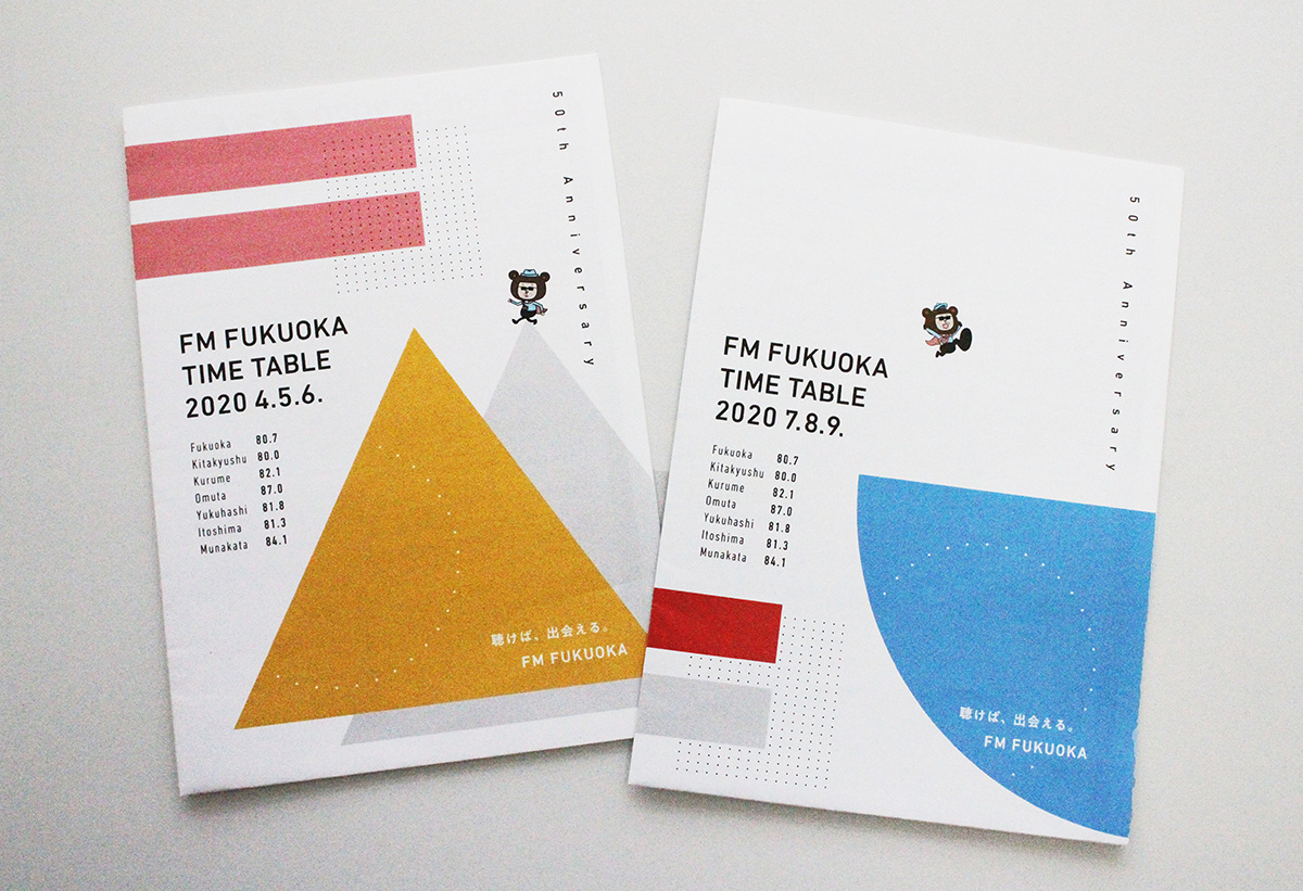 2020年、開局50周年を迎えたラジオ局「FM FUKUOKA」とコラボレーションし、同局が春夏秋冬、年4回発行する番組表(タイムテーブル)の表紙をデザインしました。夏号は、6月よりタワーレコードやTSUTAYAなどで無料配布されており、秋冬も合わせて4冊を並べると、ある言葉を表す面白い仕掛けになっています。