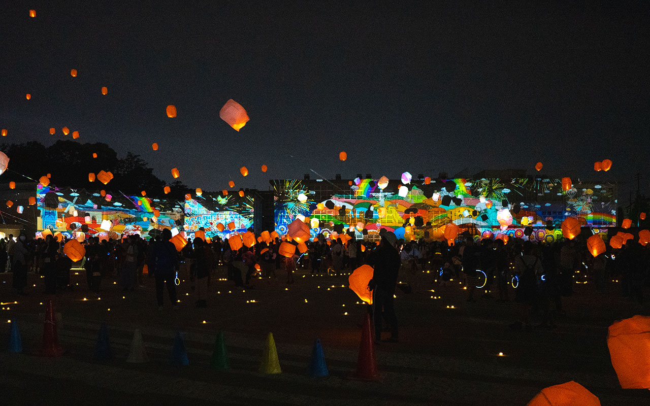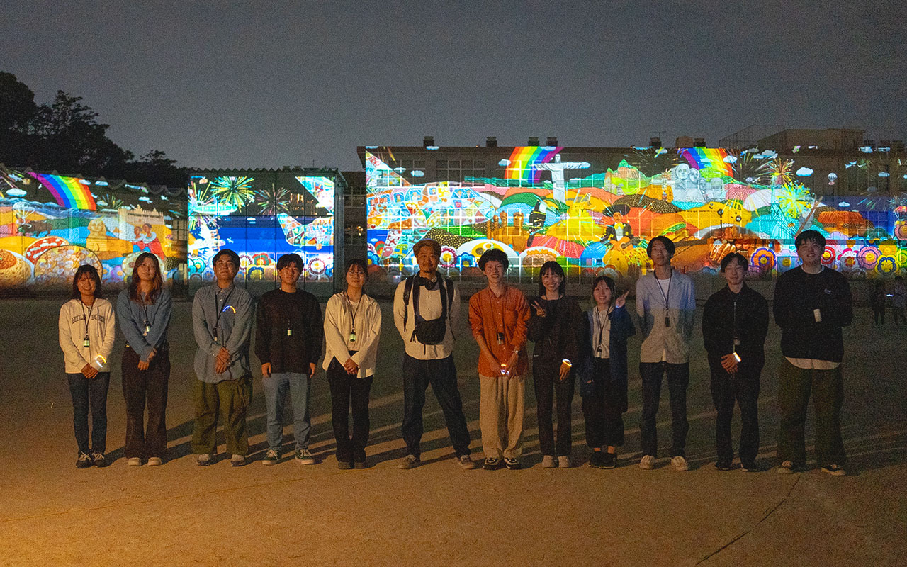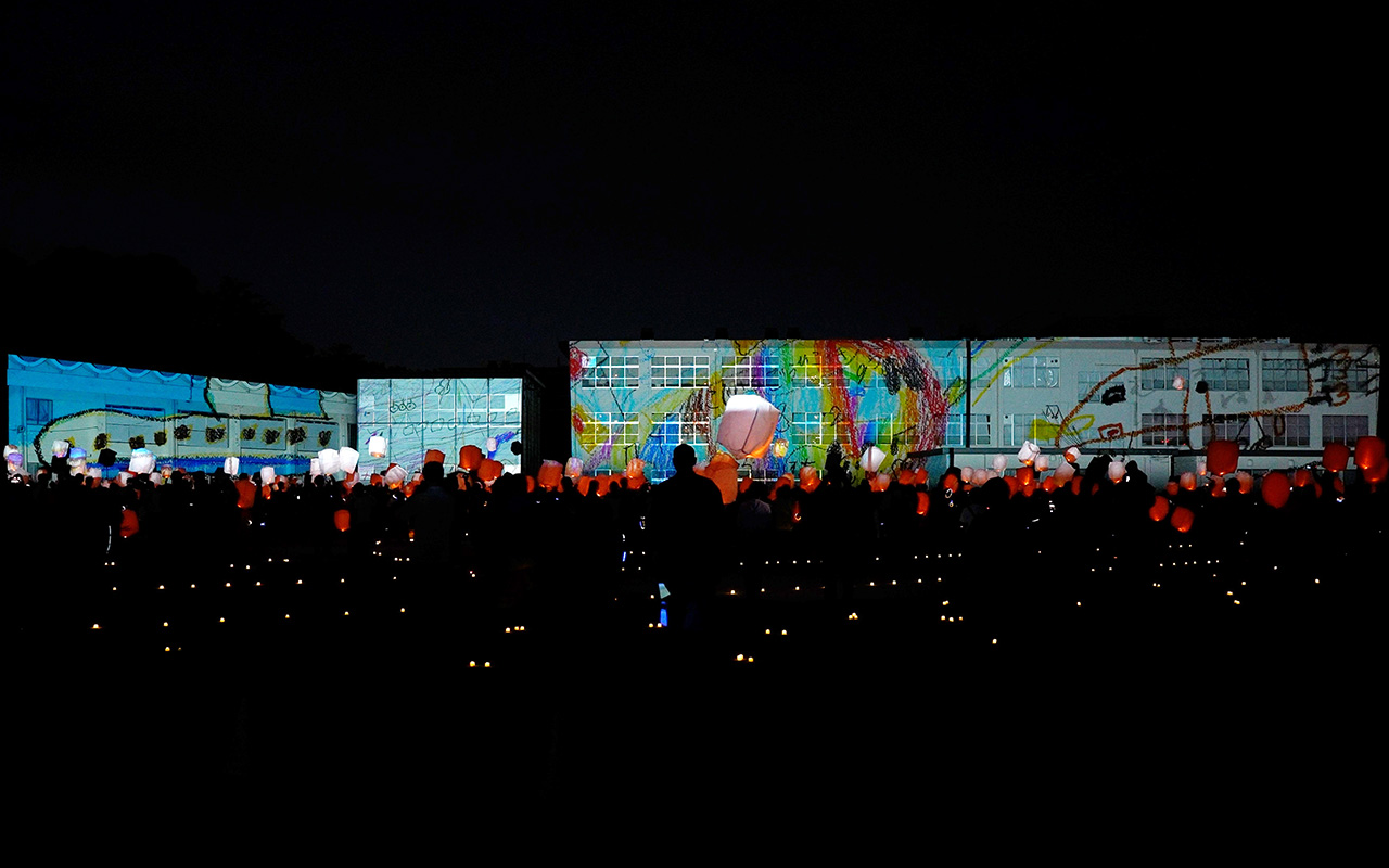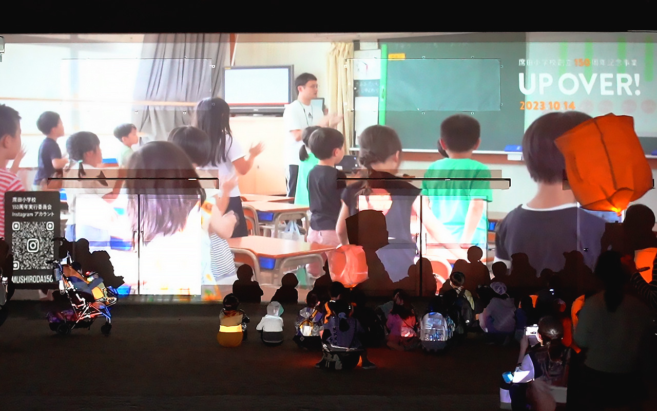 福岡市立席田小学校にて、映像投影を活用した空間演出を実施しました。席田小学校創立150周年記念事業の一環として、地域住民や保護者、そして子供たちにとって思い出深い式典になるよう、イベント演出のご依頼をいただきました。席田小学校の児童が描いた飛行機をモチーフに、アーティスト・ミヤザキケンスケ氏の壁画プロジェクトとのコラボレーションによる演出を行いました。