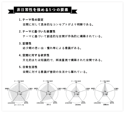 幼少の記憶による意識が多くあり、テーマに基づいた創造的な空間設計が行われており、かつ普段の生活を基準として空間が非日常に近いということが非日常的な空間である