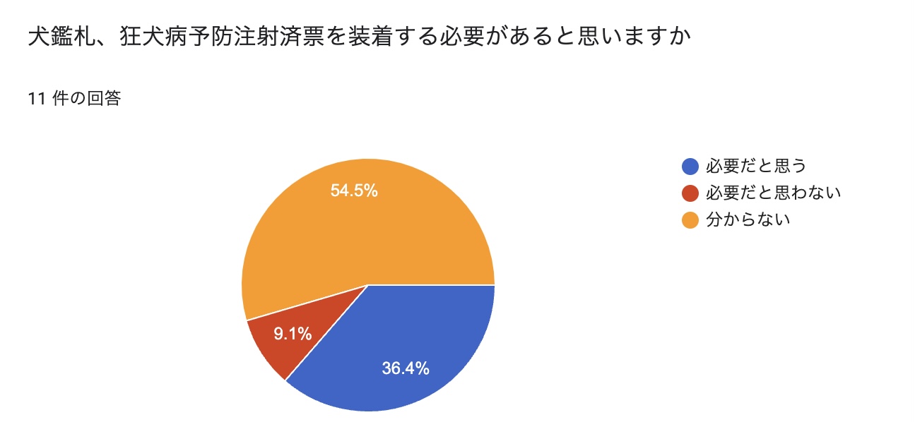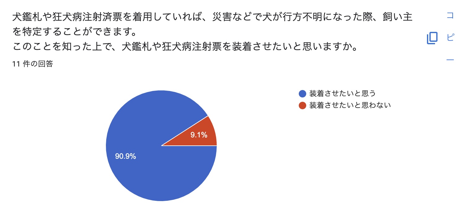 犬のリード・ハーネスや衣服についての抵抗度調査と犬鑑札・注射済票についての意識調査の二つのセッションに分けてアンケートを行った。