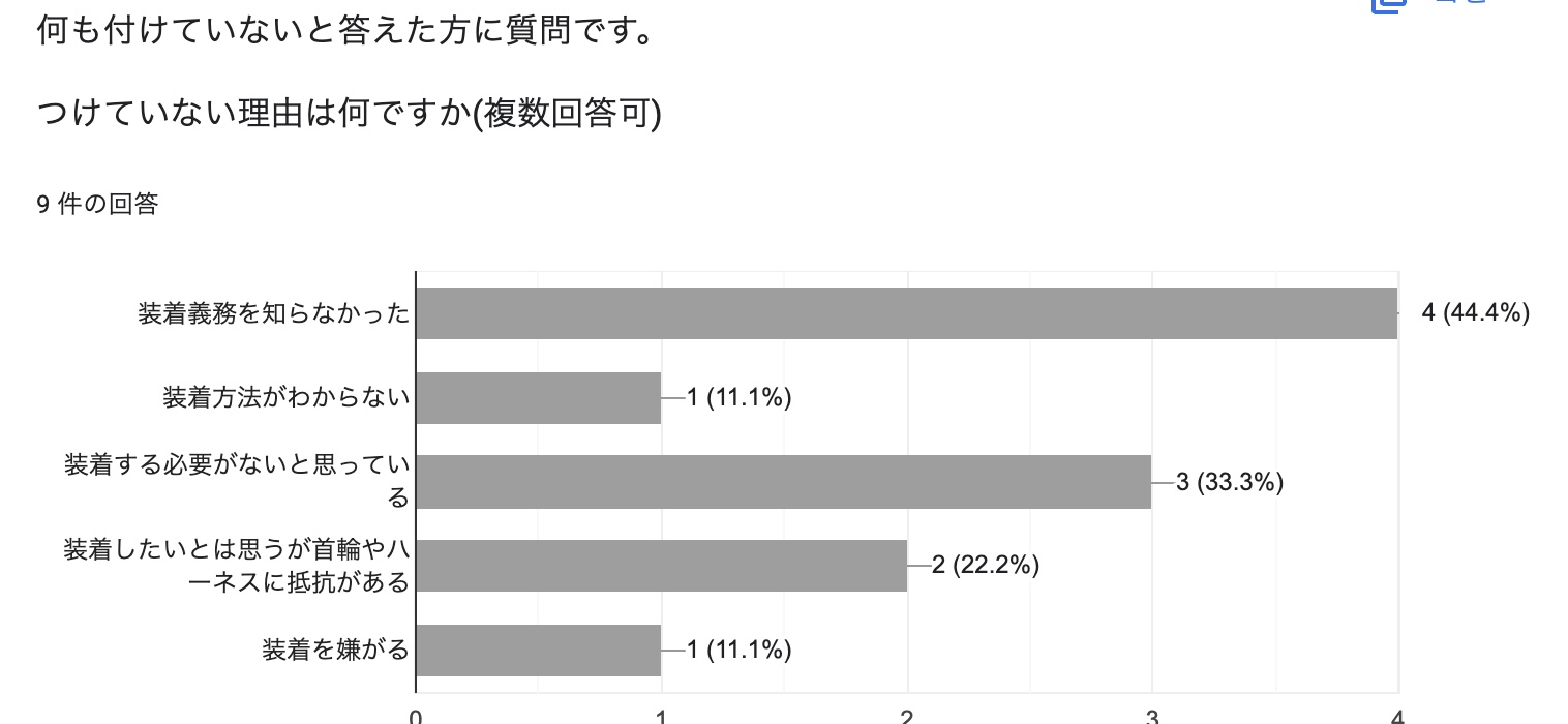 ▶︎装着をしていない理由としては装着義務を知らない 装着の必要がない 首輪やハーネスへの抵抗が挙げられる。