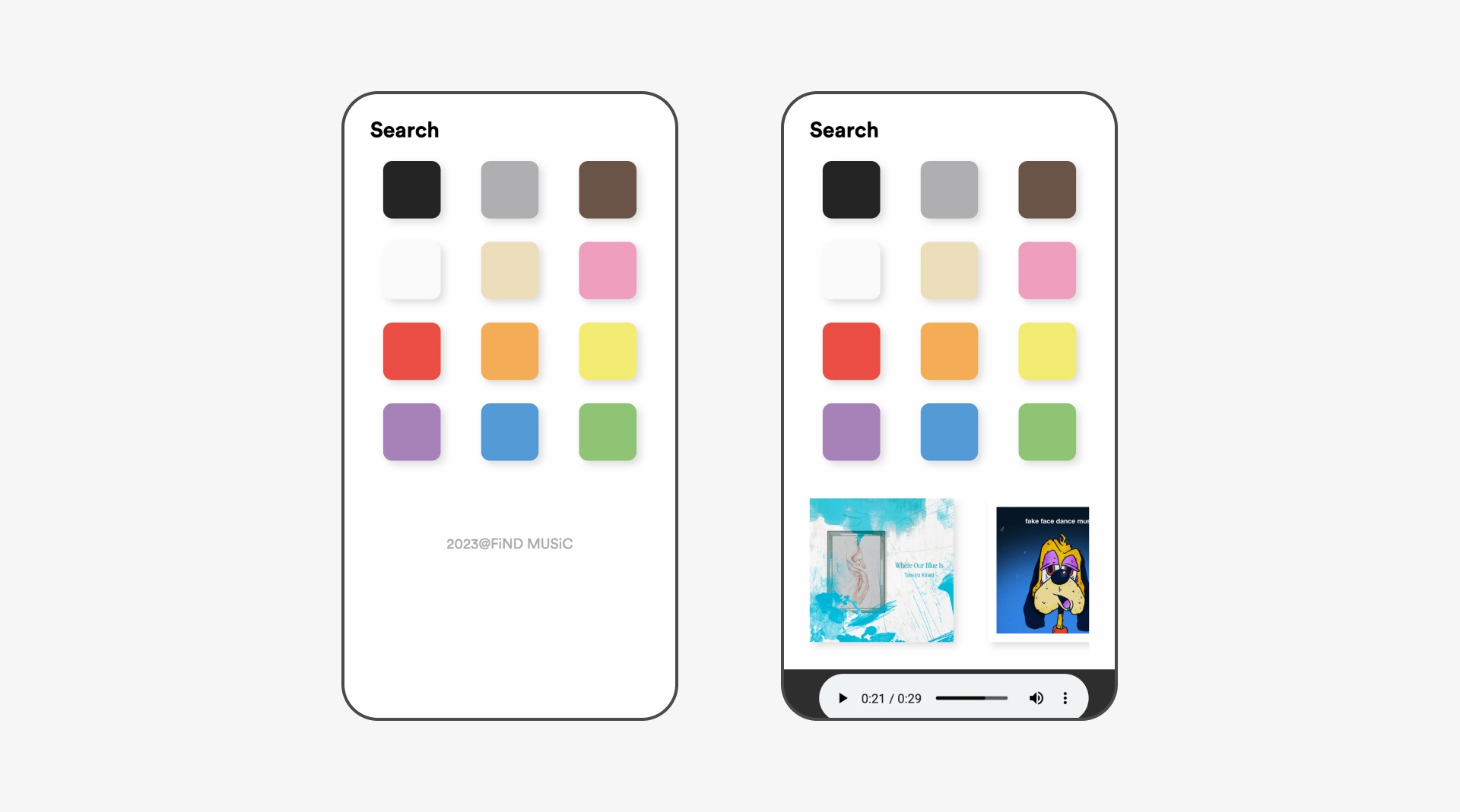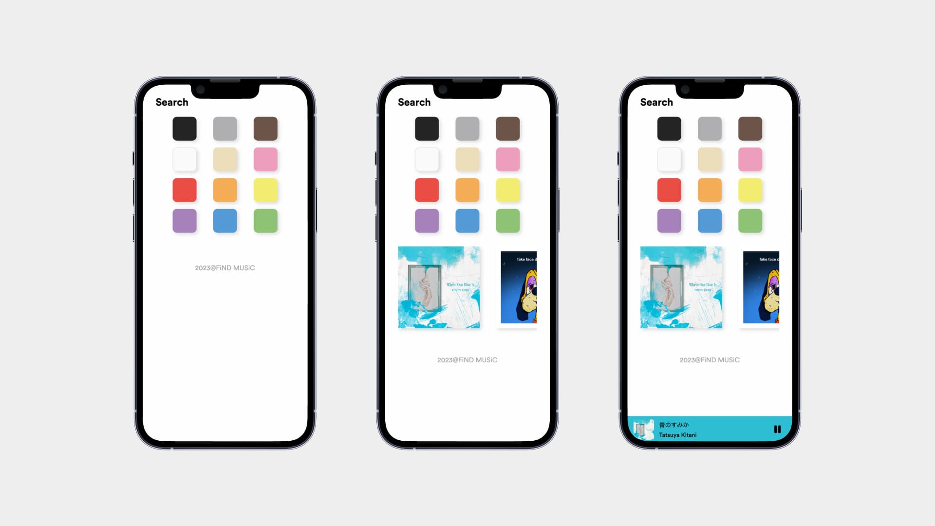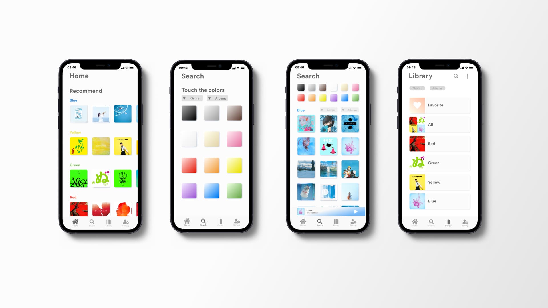 画面下のメニューからサーチ画面に移動すると12色のボタンが表示される。色ボタンをどれか1つタップするとボタンの色に関連した色のジャケット写真が色ボタンの下に表示される。表示中のジャケット写真を横スクロールすると他のジャケット写真を見ることができる。また、ジャケット写真を押すと30秒程度の試聴音源が流れる仕組みである。