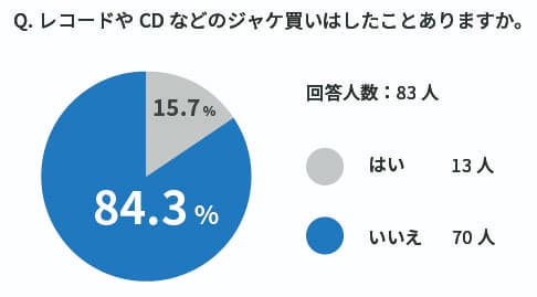 2023年5月12日から5月26日にかけてGoogleフォームにて「音楽やジャケット写真に関する調査」を行い、18~22歳の男女83人から回答を集めた。そのうち、レコードやCDのジャケ買いをしたことがある人が13人、したことない人が70人という結果が出た。また、ジャケ買いをした理由として「特定のアーティストが好きだ」「インテリアにしたら可愛いから「雰囲気が好きだった」といった理由があげられた。それに対し、ジャケ買いをしたことがない理由として回答者の半数が「特に理由はない」と回答し、その他に「興味がない」「金銭的余裕がない」といった理由があげられた。