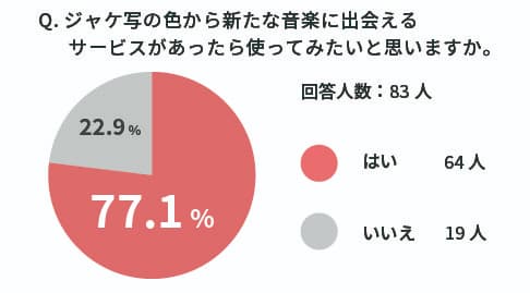 Webアプリ上での環境構築により、ユーザーはネット環境と閲覧可能な媒体があれば手軽に利用でき、API の活用により著作権を守りつつ新しい価値を生み出せるようになった。 実際のアプリ利用者の感想として「ジャケ写を色で直感的に選べるのが楽しかった」「曲名が分からない時にジャケ写の雰囲気を覚えていれば検索できるため良いと思った」といったポジティブな評価を得ることができた。このことから、Webアプリを通じて、音楽、色、ジャケット写真を組み合わせた新たな音楽体験をユーザーに提供できたと考える。