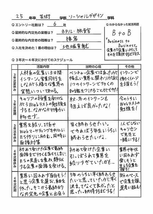 A , 先輩方のESや就活準備ガイドのようなものはすでに記載されているが、就活で困難に感じたことや経験談などをまとめられている項目はなかった。また、年間のスケジュールなどは例として1項目程度しか記載がないため、見比べることができない。さらに、知らない誰かの就活体験談を見ても、就活専用のサイトの運用側が制作した可能性があるため、信憑性が薄いと感じ、私の場合はあまり心を開いて閲覧することができなかった。