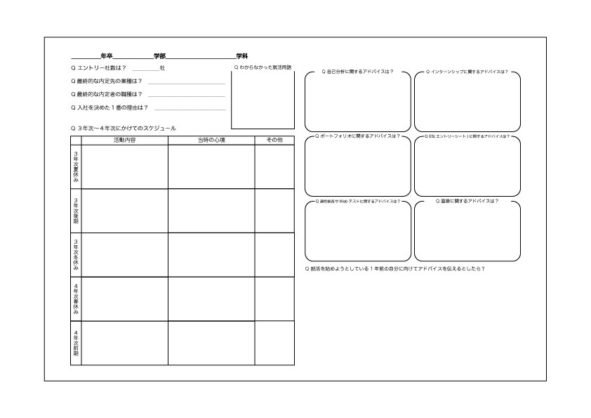 そのような時期に、大まかにでも就活に対する問題や、経験された先輩方が大事だと思っている事柄、いつの時期に何をしてきたのか、、、などがまとめられているものがあると、言葉に表せない不安感に対する質問を言語化する必要もなく、ある程度の就活の流れを理解することができ、少しでも不安が解消されると考える。