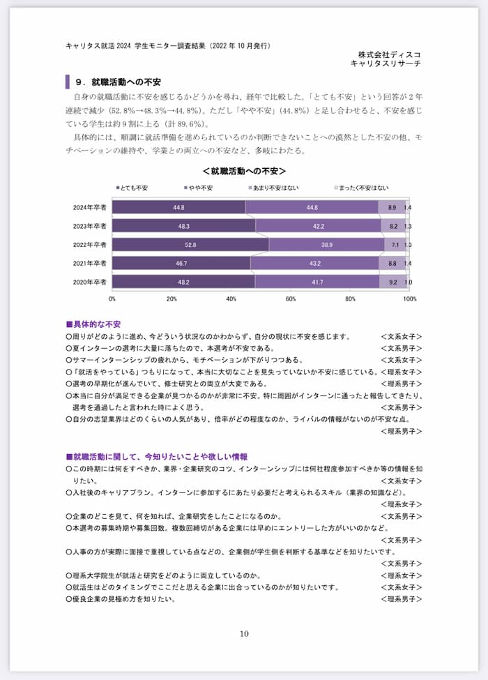 - 2024卒の学生を対象に2022年の10月(2024卒の学生が大学3年次の10月)に就職活動への不安について回答したアンケート結果。「とても不安」「やや不安」と回答した学生は約9割に上った。