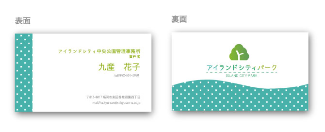 香椎浜アイランドシティ中央公園のヴィジュアル・アイデンティティ計画 制作物(プレゼンボード)A3 ① シンボルマーク+ロゴタイプ ② 名刺 ③ +α ・パンフレット ・ポスター ・WEBサイト など