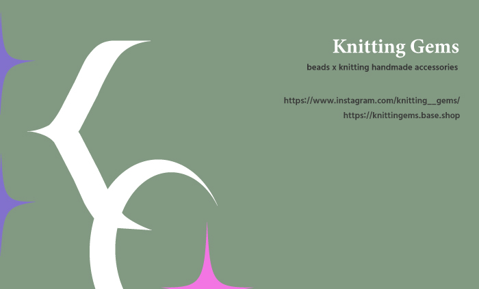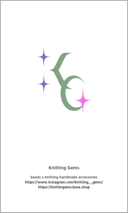 Knitting Gems :「Knitting」はニット、「Gems」は宝石(ビーズ)という意味で、編み物とキラキラとした宝石(ビーズ)の融合がイメージできる。お洒落で、女性的で、可愛いけど可愛すぎない雰囲気を伝えるために、アルファベット表記に決めた。