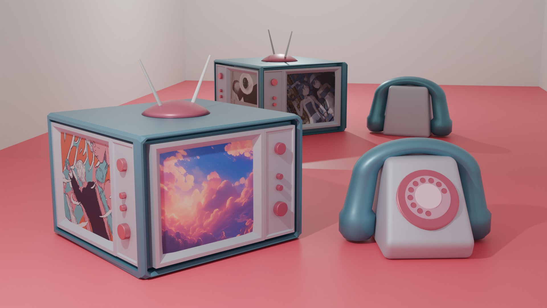 4画面観れるテレビと、無駄に受話器が長い電話のレトロで不思議な家電です。
