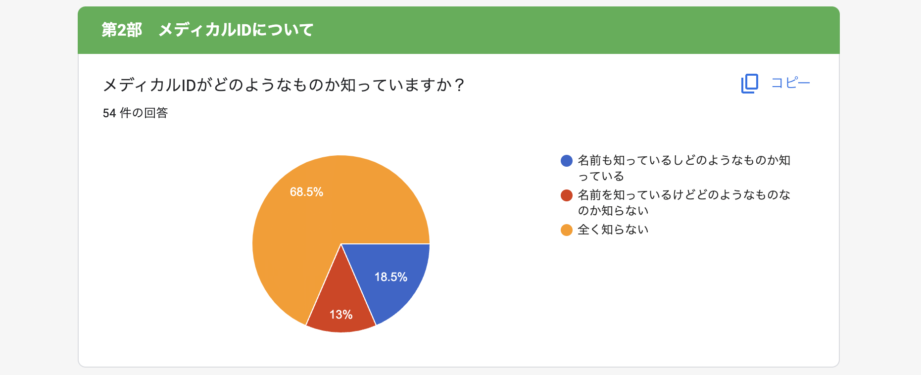 「ヘルプマークに関するアンケート」の結果から、ヘルプマークの認知度は高いものの、メディカルIDの認知度・設定率・使用率がどれも非常に低い事がわかった。その為、免許証や保険証など、本人は特定できても家族に連絡を取る事ができないものと比べ、メディカルIDは持病の有無に関わらず、災害時や緊急事態の時にも情報を設定しておけば、家族と連絡を取り合うことができ、個人情報を簡単に共有する事ができる。その為、メディカルIDの認知度向上に取りくむ必要性があると感じた。