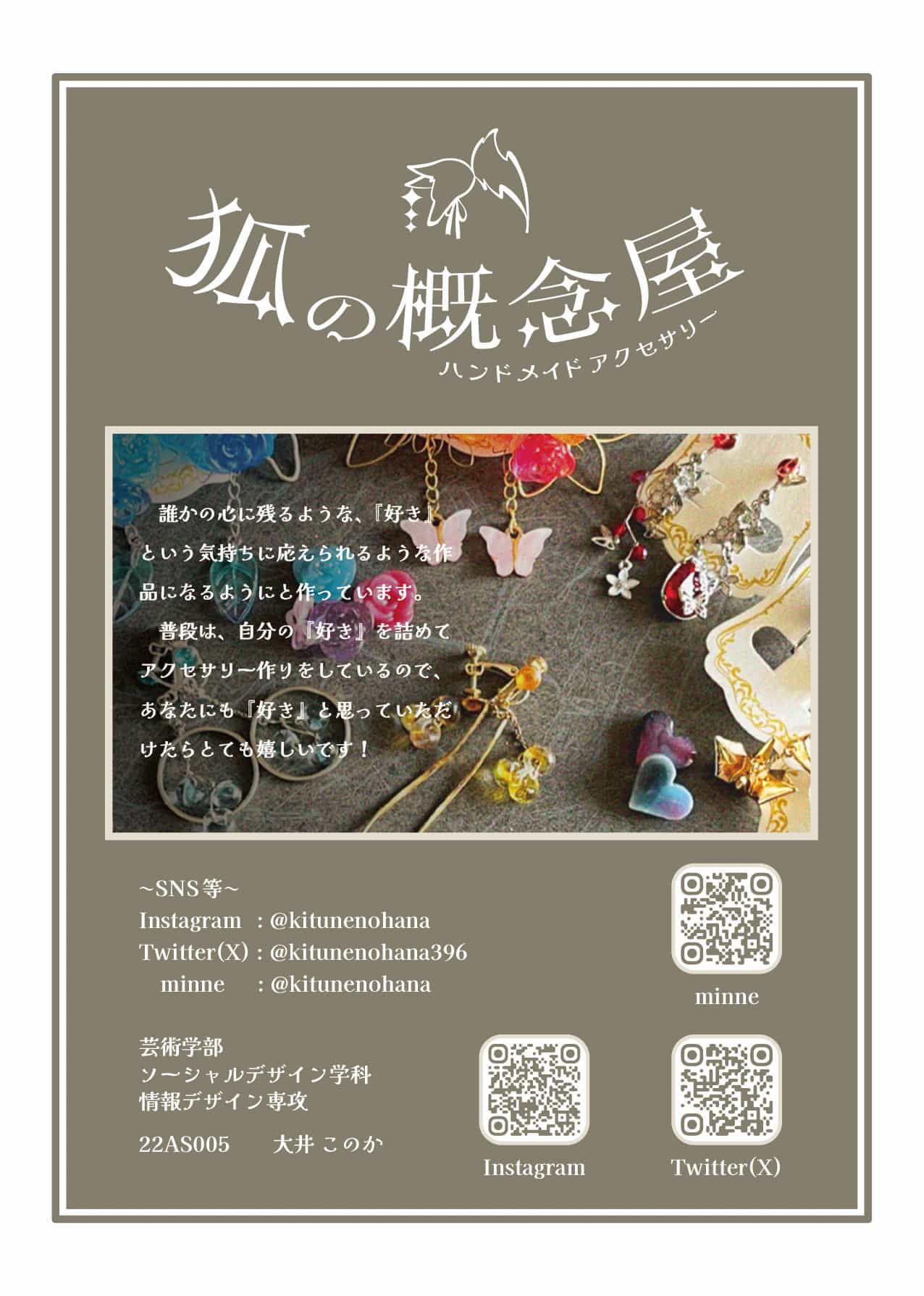 まだ学祭以外で販売するには至っていないが、この研究を通して作成した VI 計画などをもとに、オーダーメイドのア クセサリー注文ができるようにするなど、今後も『何かを好き!推している!』と言う気持ちをもった人たちに寄り添えるようなショップのブランディングを行っていきたい。