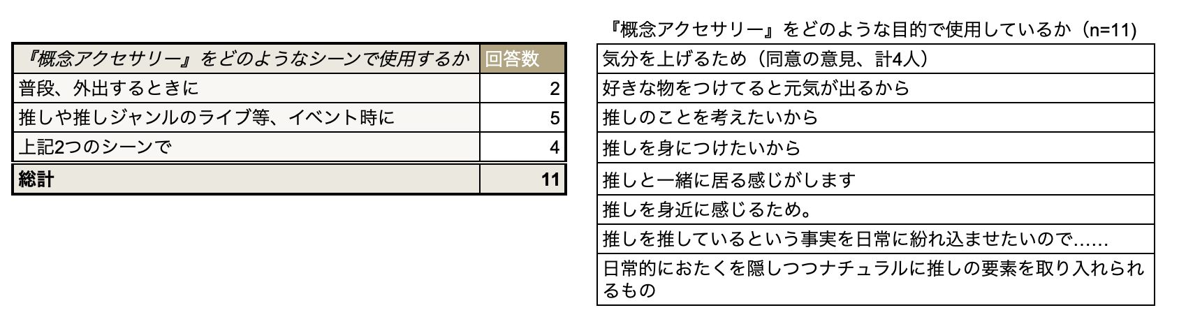 昨今、推しがプリントされたキーホルダーや缶バッジ、Tシャツなどの直接的なグッズだけではなく、推しをイメージした香水やアクセサリーといった”概念的な”グッズを持つことが流行っている。公式が概念的なグッズを出すこともあるが、ファンが自作することも多い。