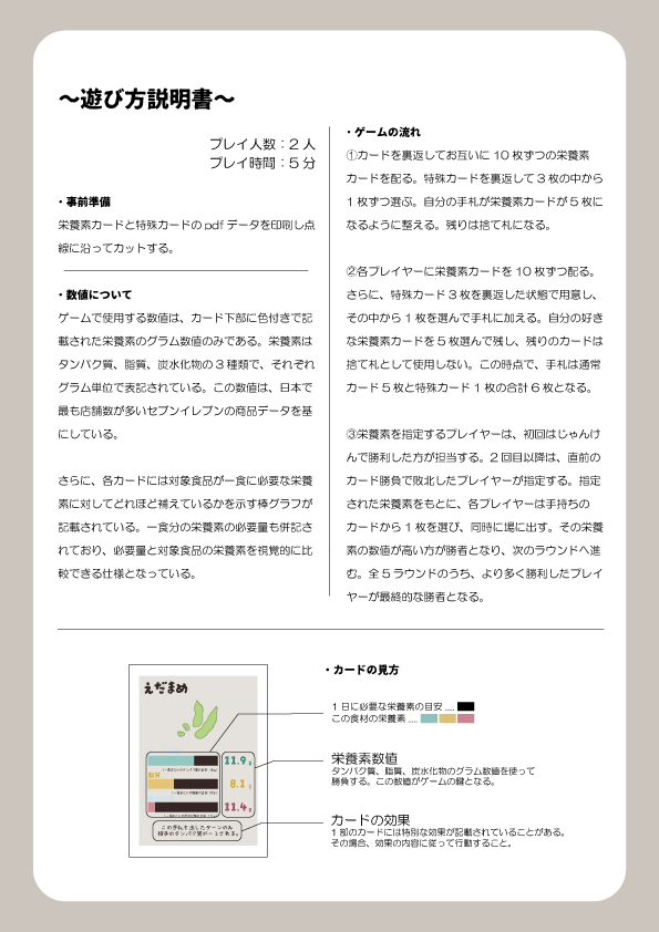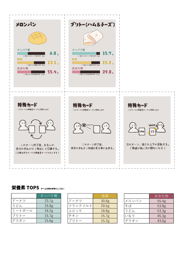 素材を印刷して切るだけで栄養素や食材の知識を気軽に遊びながら学べるカードゲーム。