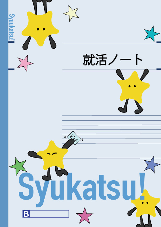「就活ノート」と手書きで表紙を描いた時のことを想定した際の、ノート全体のバランスや色使いを考慮した結果、表紙の決定を行なった。