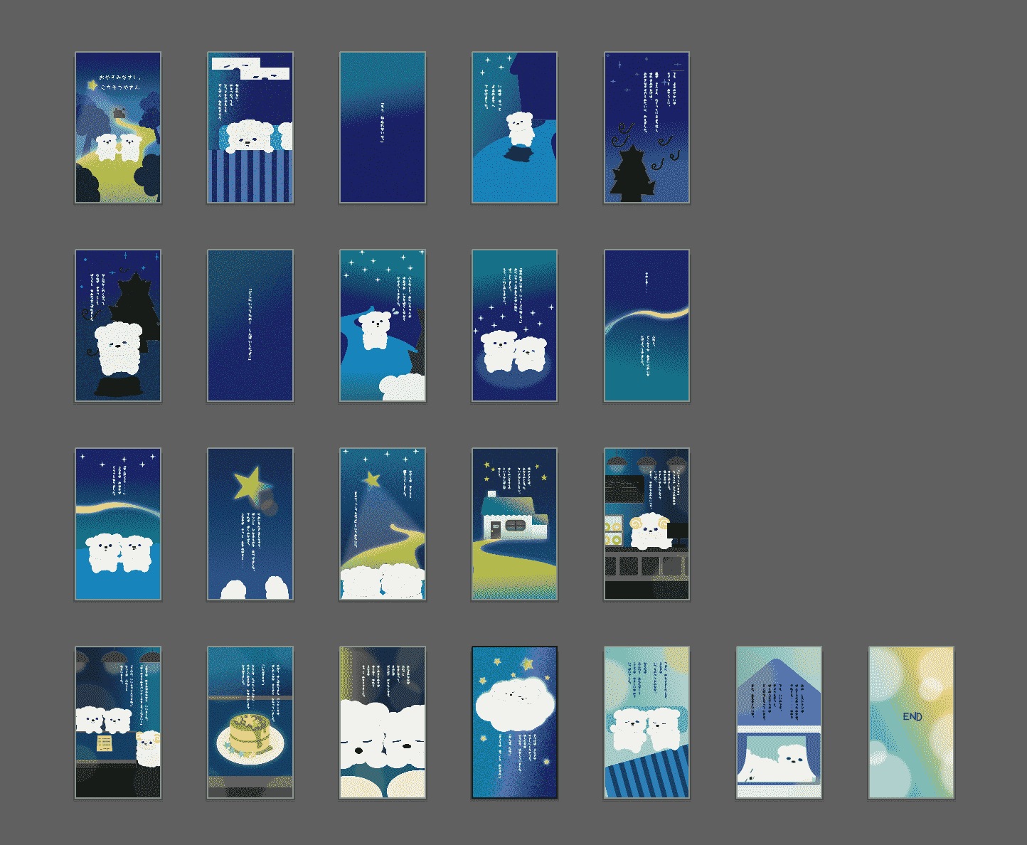 現代社会では、仕事や対人関係、将来への不安など、さまざまな要因からストレスや精神的疲労を抱える人が増加している。特にその影響は「睡眠」に現れやすく、不眠や浅い眠りに悩む人も多い。そこで、心を穏やかにし、リラックスできる時間を提供することを目的として、WEB上で楽しめる絵本コンテンツを制作する。本企画では「睡眠」をテーマに、やさしい物語と穏やかなビジュアル、音や色彩などの要素を組み合わせることで、視覚的・感覚的に癒される体験を目指す。日常の中で緊張状態にある人々が、一時でも心を解きほぐし、「睡眠」に対して少しでもポジティブな気持ちになれるような“癒しの時間”を届けることを目的とする。