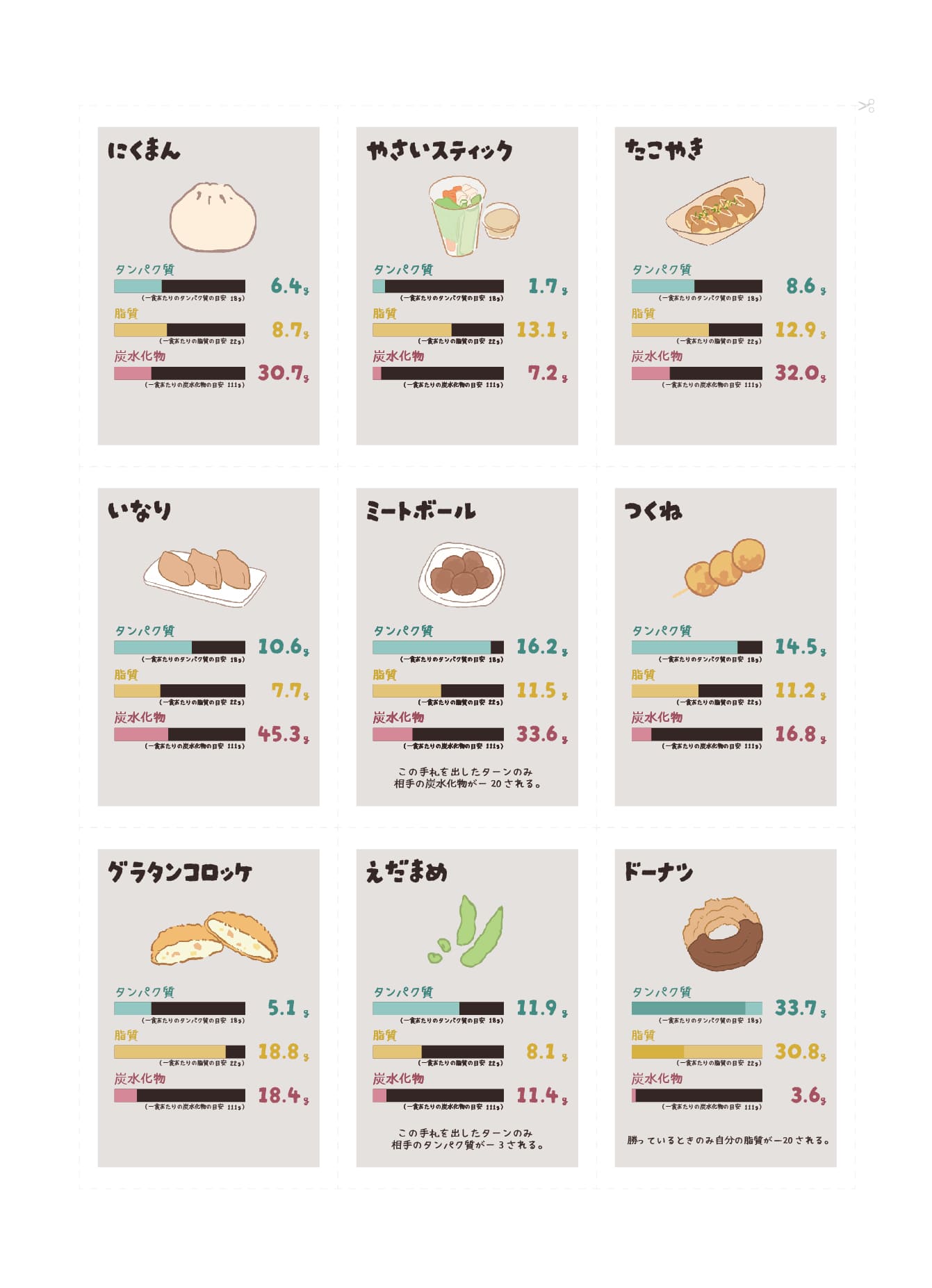 イラストと三大栄養素(脂質、タンパク質、炭水化物)の三つの数値が書かれている。