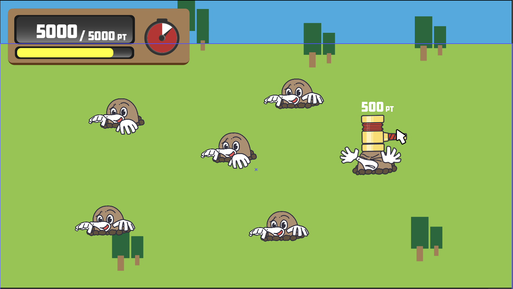 モグラ叩きに新たなシステムや要素を追加することを想定し、細かい演出などで爽快感を出し、直感的なUI・HUDでスムーズで快適なプレイ体験を目指す。