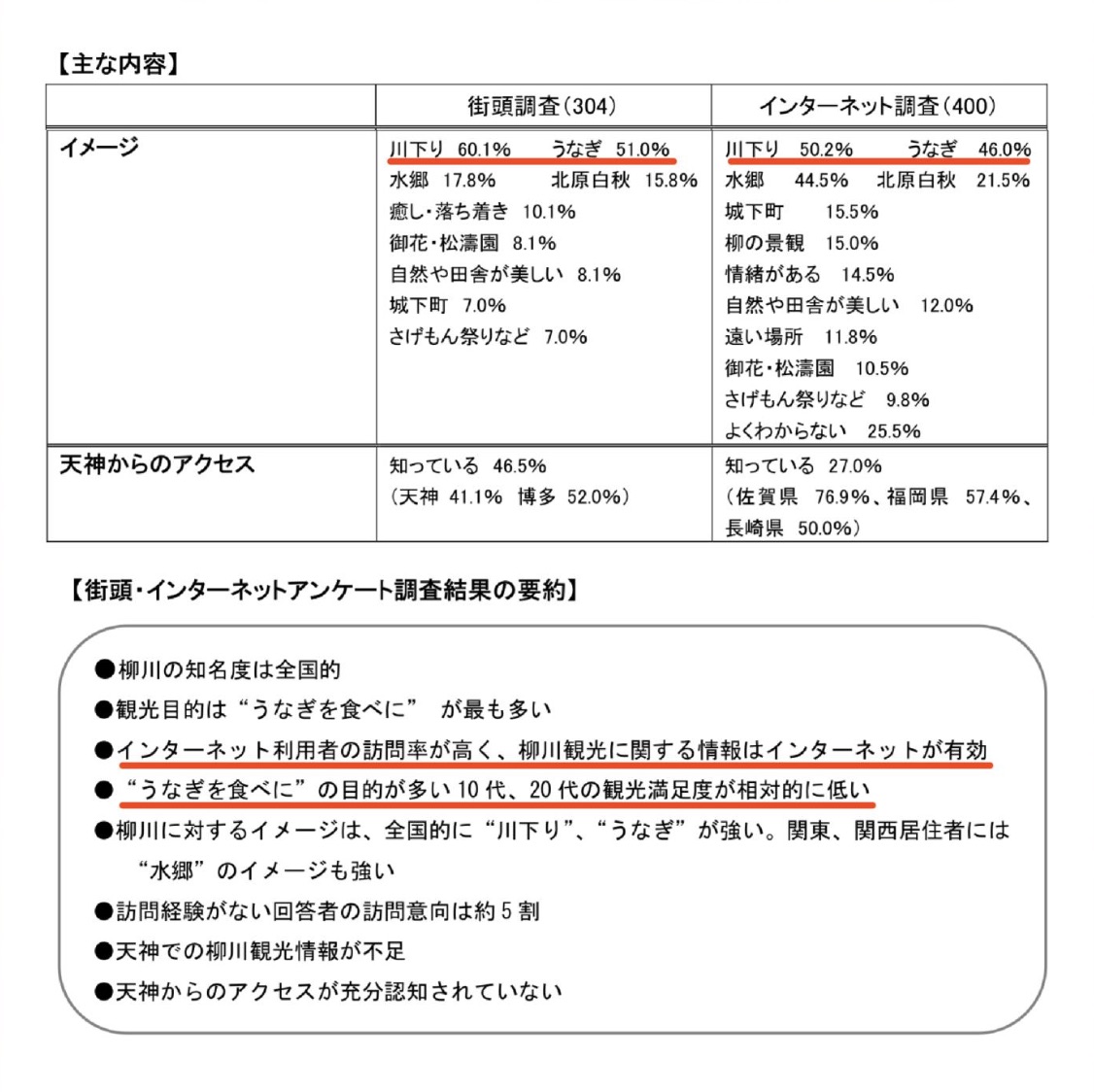 従来、柳川観光のイメージは“川下り”と“うなぎ”に偏っており、その他の観光資源の認知度は低い。柳川と聞いて多くの人が連想するのは「川下り」と「うなぎ」であり、他の観光資源の認知度は一割未満と低い結果となっている。特に10代・20代では「うなぎを食べに行く」目的が多いが、価格の高さから満足度が相対的に低い傾向にあり柳川の魅力を十分に体感できずに帰る観光客も多い。柳川市の観光に関する調査では、インターネット利用者の訪問率が高く、情報発信手段としてWebの有効性が確認された。このことから、川下りやうなぎ以外の地域資源やイベントの魅力を発信するWebサイトづくりが今後の課題とされている。