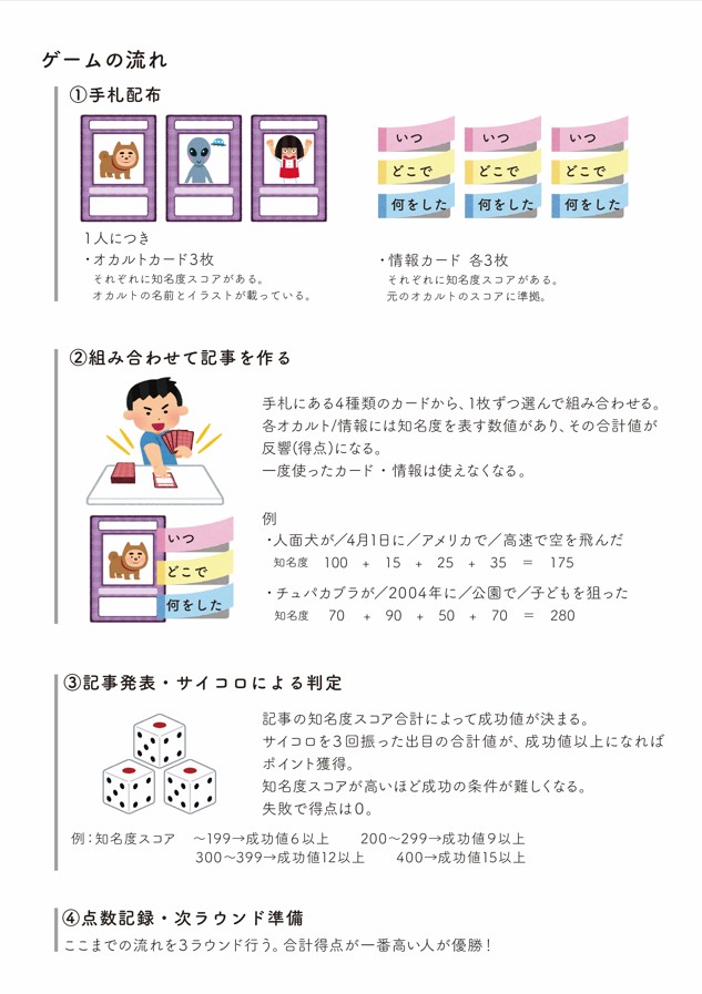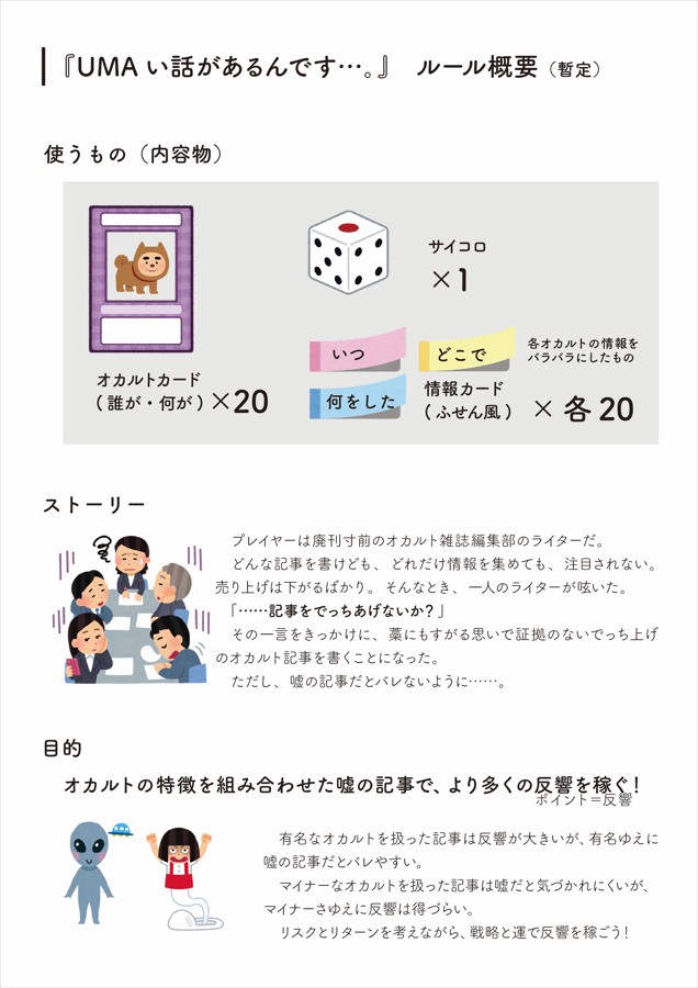 媒体としてアナログゲーム(カードゲーム)を選んだのは、カード(情報)を組み合わせて遊ぶという体験が、オカルトの持つ「不確かさ」や「つぎはぎ感」を再現できると考えたからである。また、近年アナログゲームは幅広い層に親しまれ、気軽に楽しみながらテーマに触れてもらう手段として適していると感じたため。