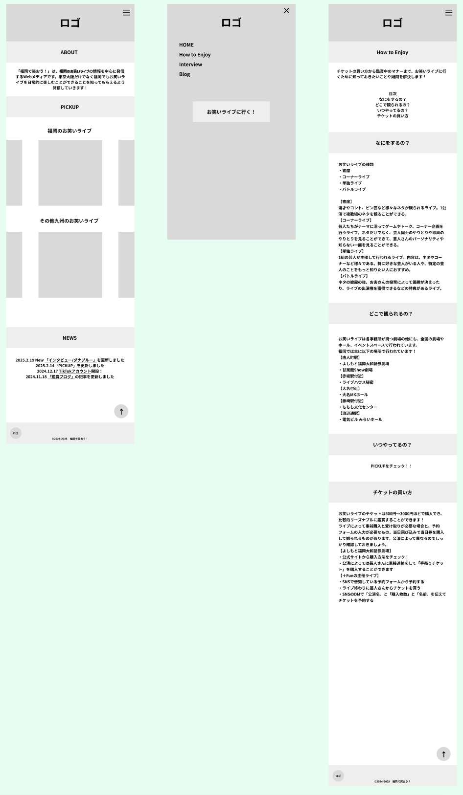 福岡のお笑いライブに足を運び、チケットの買い方などの手引きやライブの様子をブログ形式で掲載することで、このサイトを見ればお笑いライブの雰囲気や行き方がわかるものにする。