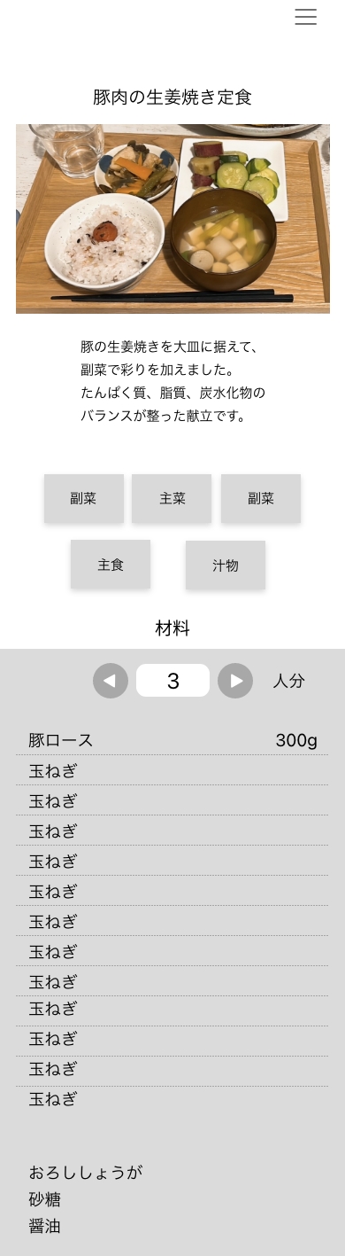 ※ハンバーガーメニューの献立にもどるを2度選択すると手順のページに飛べます。