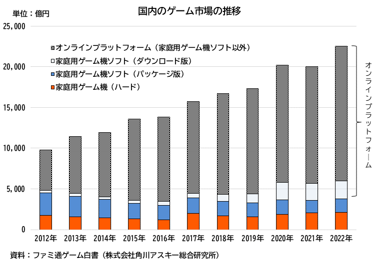 近年国内のゲーム市場は2020年には2兆円を突破し、高い市場規模を維持している。内訳はスマートフォンやパソコンを利用する「オンラインプラットフォーム(家庭用ゲーム機ソフト以外) 」が最も多く80パーセントを占めている。このことからオンラインプラットフォームがゲーム業界をけん引していることがわかる。