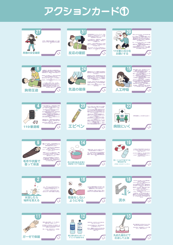 応急手当の基本的な知識や手順を楽しく学べる。