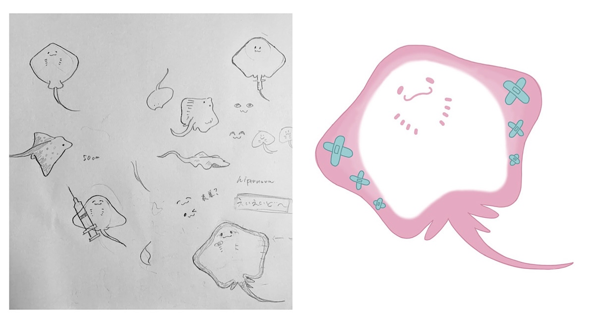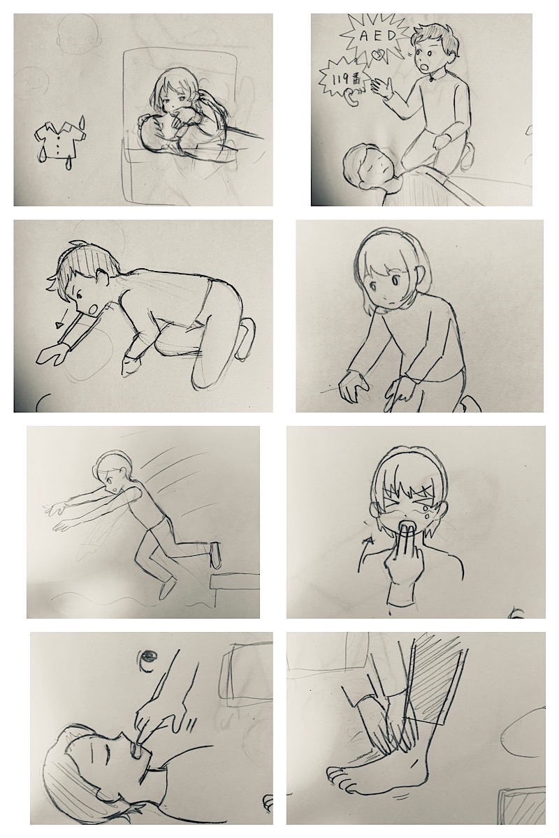 総務省消防庁が提供している eラーニングや日本赤十字社の心配蘇生のリーフレット、自撮り、先行作品を参考にラフをアナログで作成