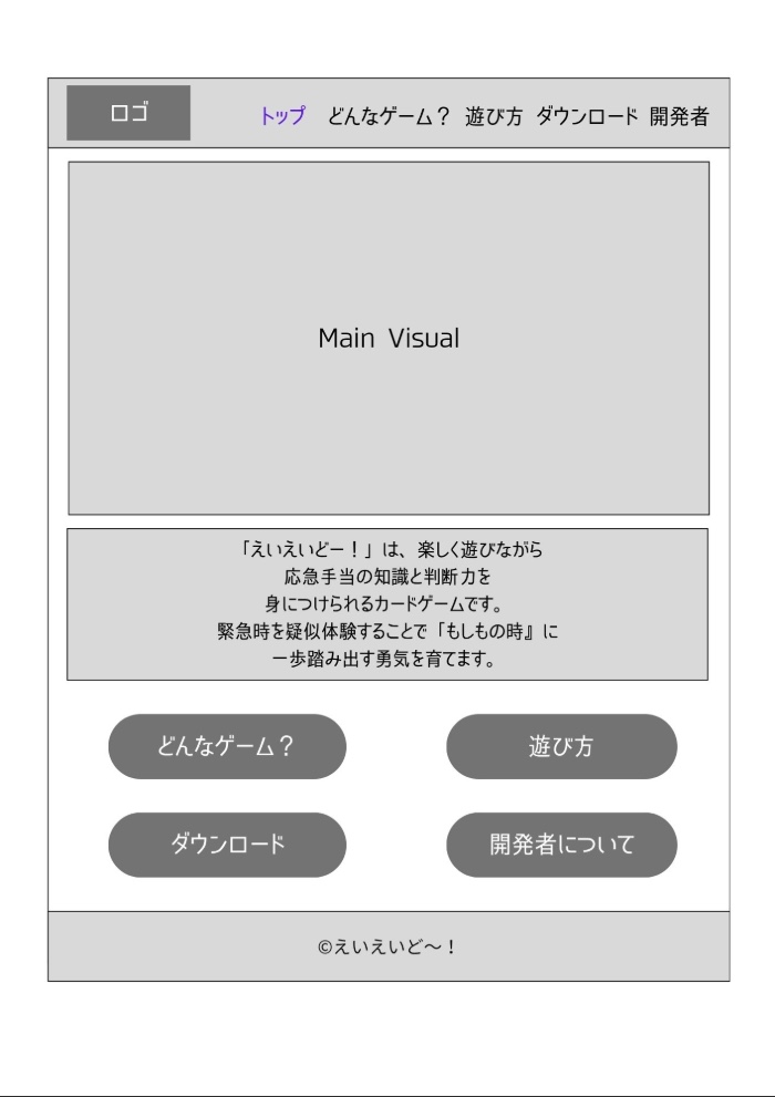 ゲーム名「えいえいど〜!」は、応急手当を意味する英語 First aid(ファーストエイド) の「エイド(aid)」と、掛け声「えいえいお〜!」を組み合わせた造語である。応援のような明るい印象と「aid(助ける)」の意味を重ね、前向きに応急処置を学ぶイメージを込めて名づけた。